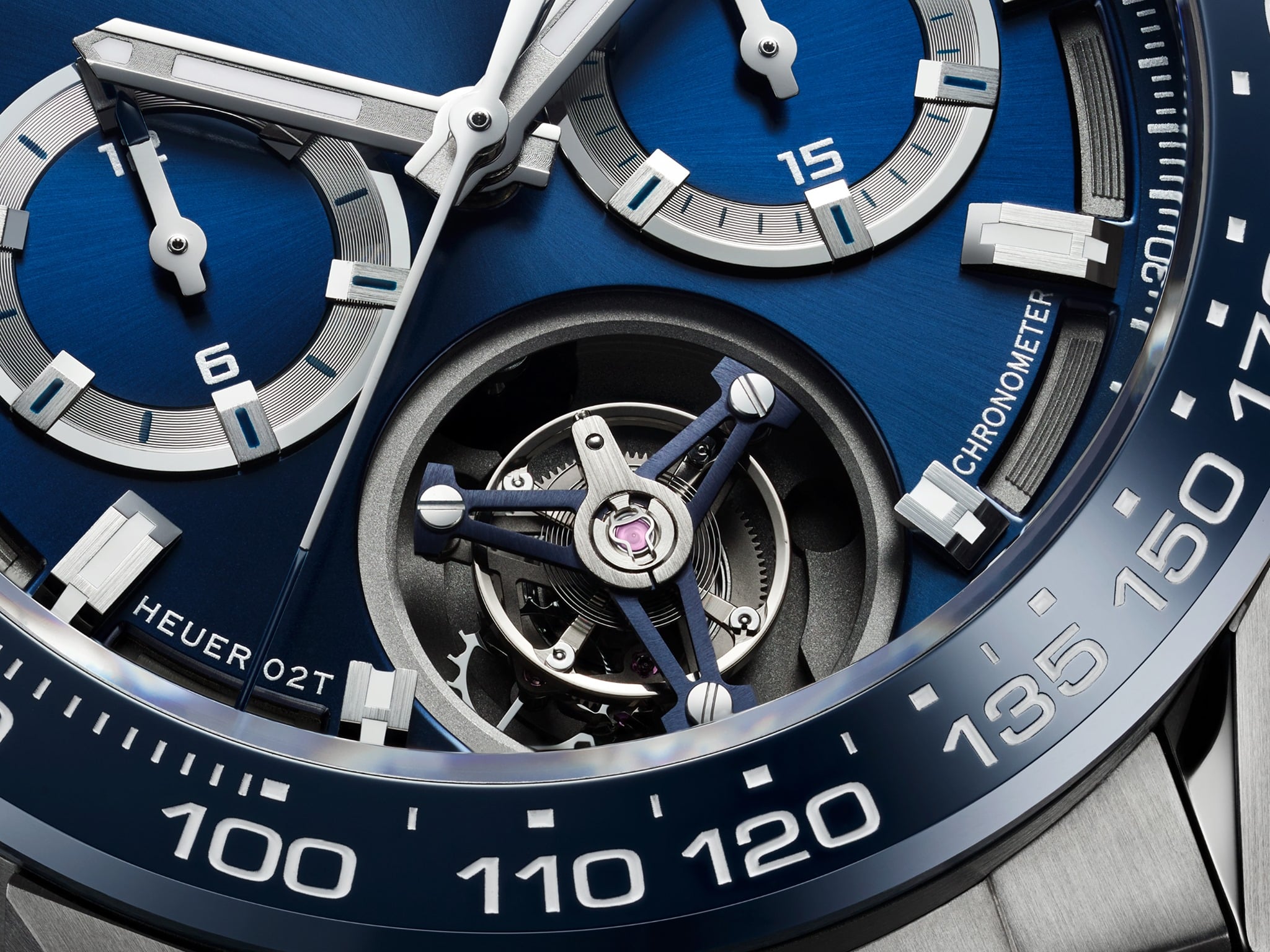 Por primera vez, el Carrera Heuer 02T tiene una carátula con un diseño de rayos de sol azul que crea un efecto bellísimo cuando el astro mayor “lo golpea”. Incluso el bisel de cerámica –con escala taquimétrica– tiene un acabado a juego. Al dar la vuelta, el calibre de manufactura se observa por el fondo de cristal de zafiro, y a la masa oscilante se le ha dado un recubrimiento de PVD para complementar el look azulado.