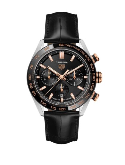 Cada uno de los Carrera Sport Chronograph 44 mm está presentado en caja de acero inoxidable con 44 mm de diámetro, acabados pulido y cepillado. La pieza muestra un rediseño de cuernos, caja, bisel y posición del cristal de zafiro, logrando mayor elegancia y atemporalidad.