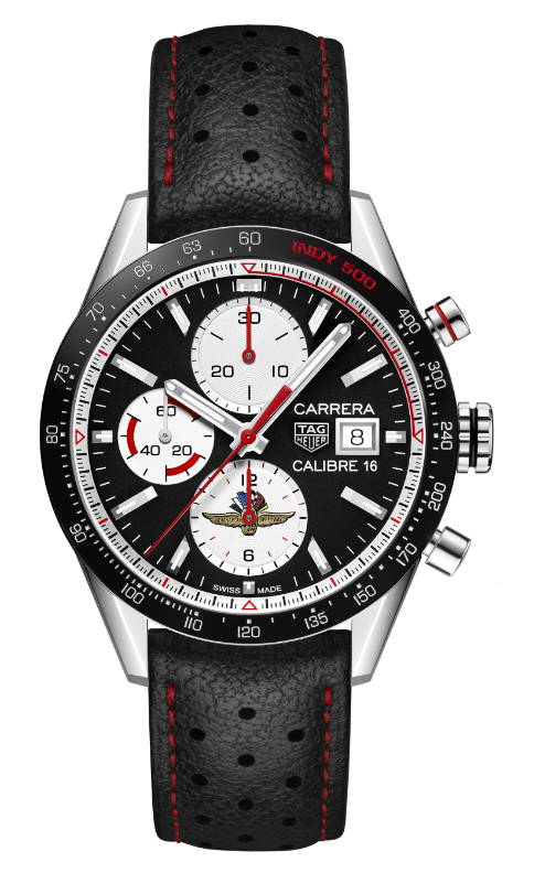 Desarrollada en caja de acero inoxidable con 41 mm de diámetro, la pieza está disponible con una correa de piel de becerro perforada color negro, clara vinculación a la emoción del automovilismo deportivo. El logo de la Indy 500 está grabado en el totalizador de las 6, mientras que en el interior vibra el calibre 16, de cronógrafo automático 16 (ETA 7750), a 4 Hz y continuará haciéndolo durante 42 horas.