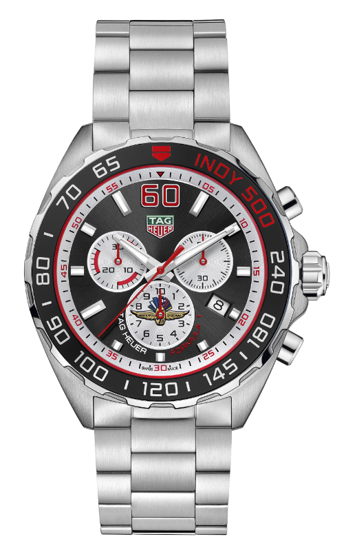 Con un diámetro de 43 mm, esta pieza luce la inscripción Indy 500 justo en el totalizador de las horas. Al mismo tiempo que porta un bisel con escala taquimétrica en color antracita. Cuenta con una trotadora en color rojo y en su interior vibra un calibre de cuarzo de alta precisión. Ambos se entregan en estuche especial y lucen un fondo de caja con significado.