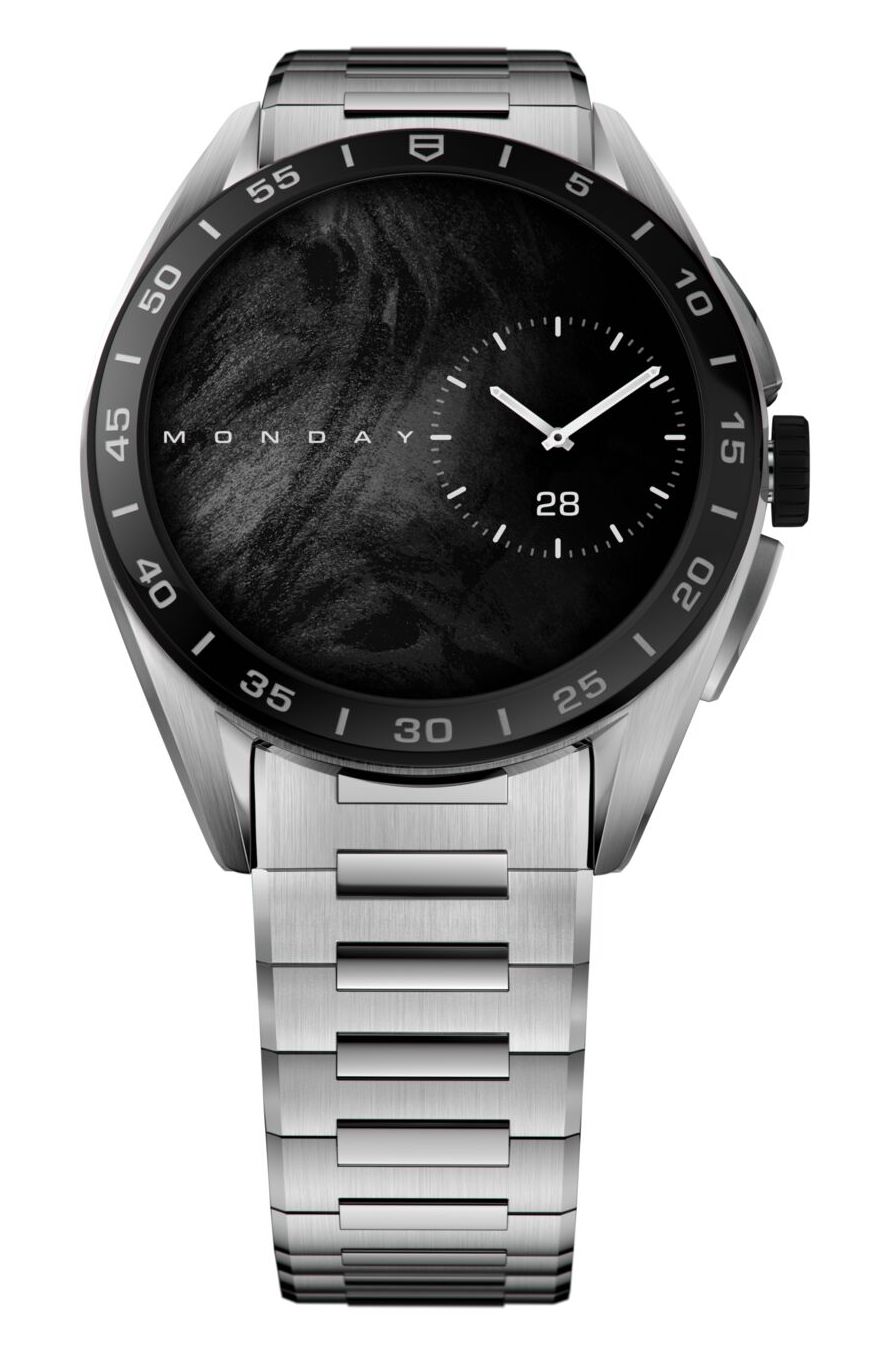 Por su parte, el TAG Heuer Connected Calibre E4 de 45 mm es más robusto y, en ese sentido, nos recuerda más a un Carrera con movimiento mecánico. Su caja es de acero o de titanio negro DLC de grado 2. El bisel de cerámica con escala de minutos tiene una presencia muy poderosa. Hay algunos cambios en el diseño en relación con los modelos anteriores.