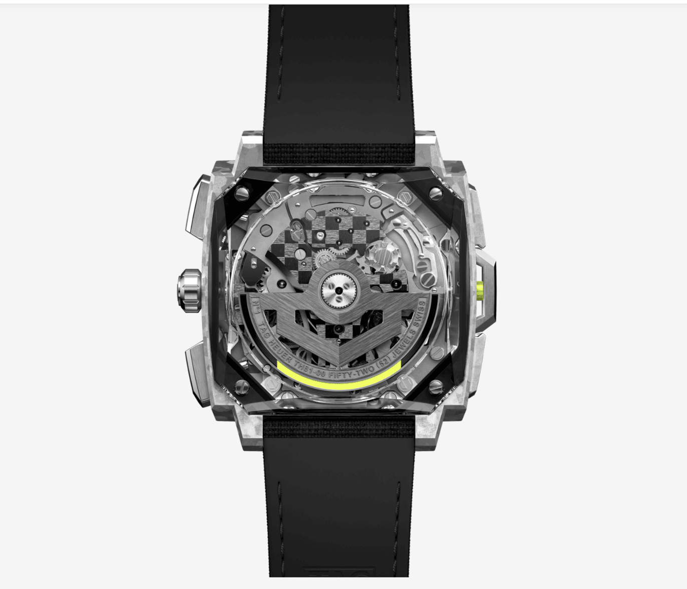 Todo el mecanismo, que está enmarcado en zafiro, pesa tan solo 30 gramos, contribuyendo a la extraordinaria ligereza del reloj que pesa solo 86 gramos incluyendo correa y hebilla. Además, es todo visible gracias a su cubierta de zafiro.