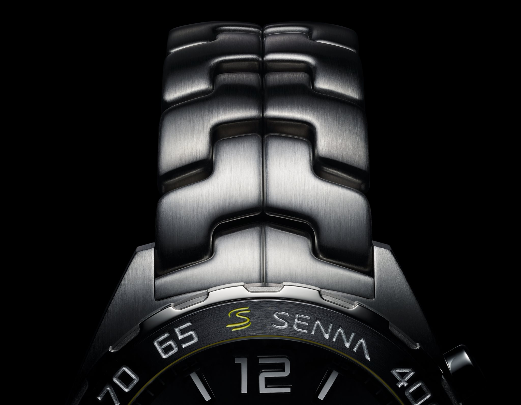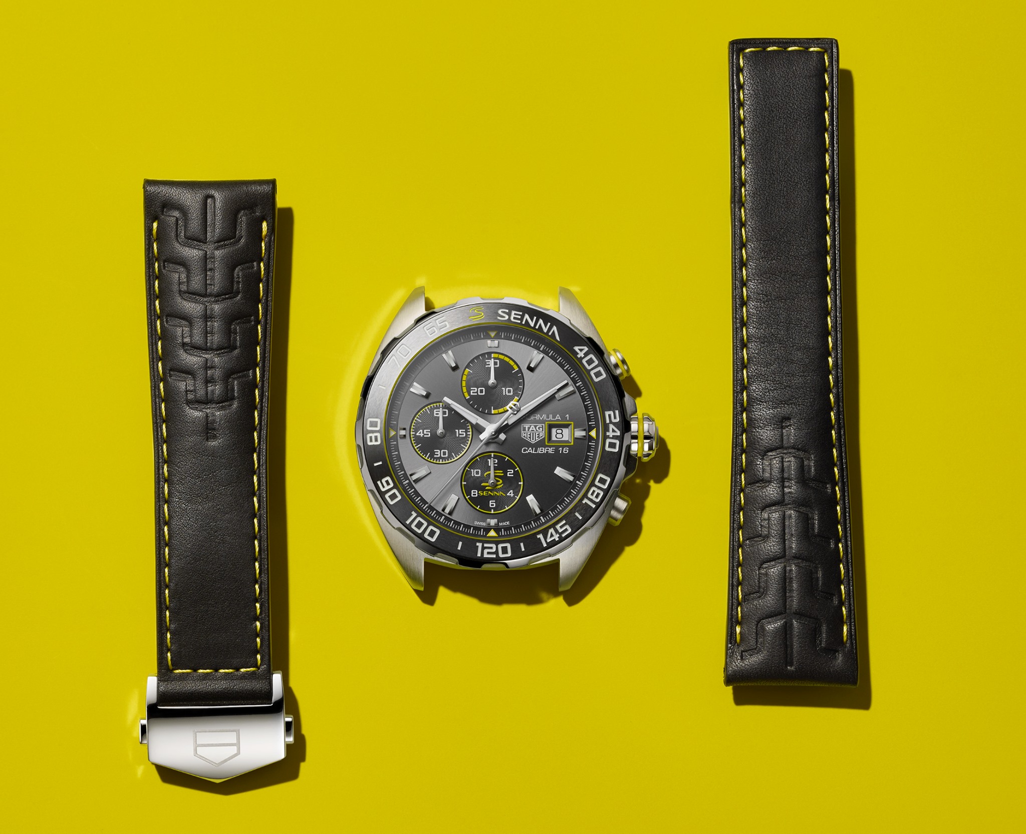 Porta una correa de piel de becerro negra con forro a juego y costuras en amarillo que combinan con los coloridos detalles en la carátula, alrededor de la ventana de fecha, alrededor del bisel y en el pulsador superior y la corona. Un guiño adicional a Senna es el patrón “S” en relieve en el strap, que recuerda a los eslabones de su brazalete de acero inoxidable TAG Heuer favorito.