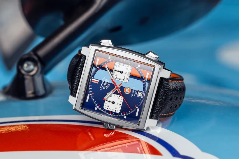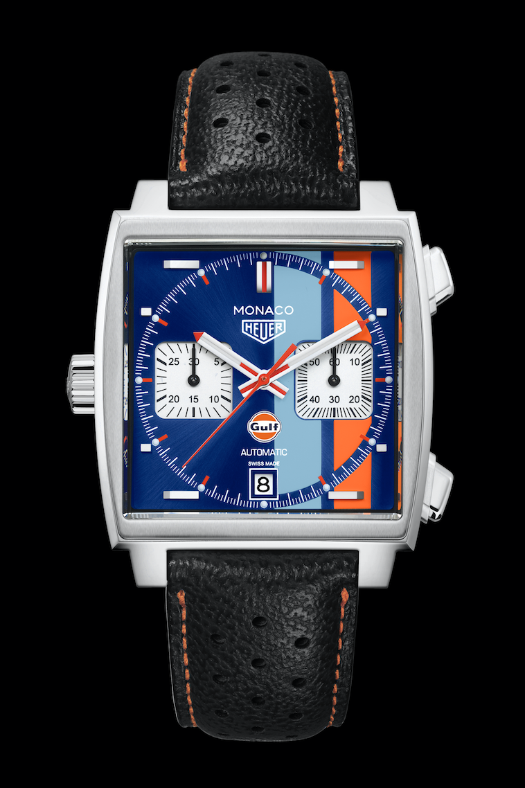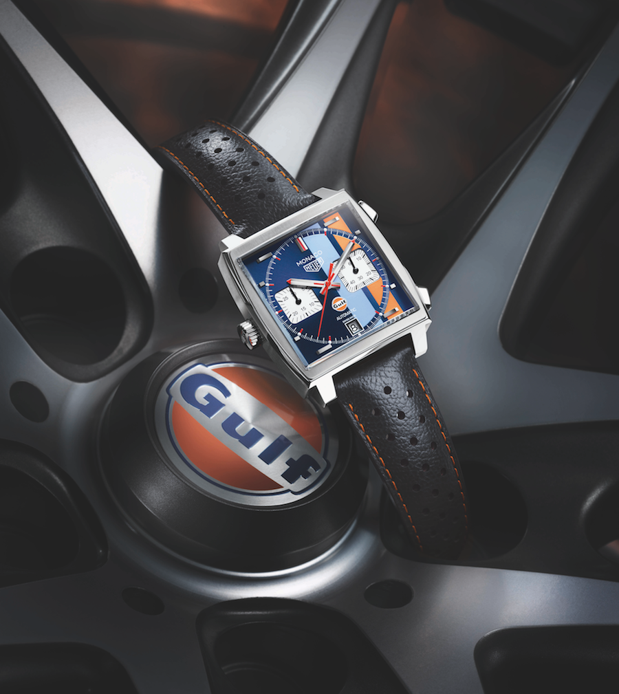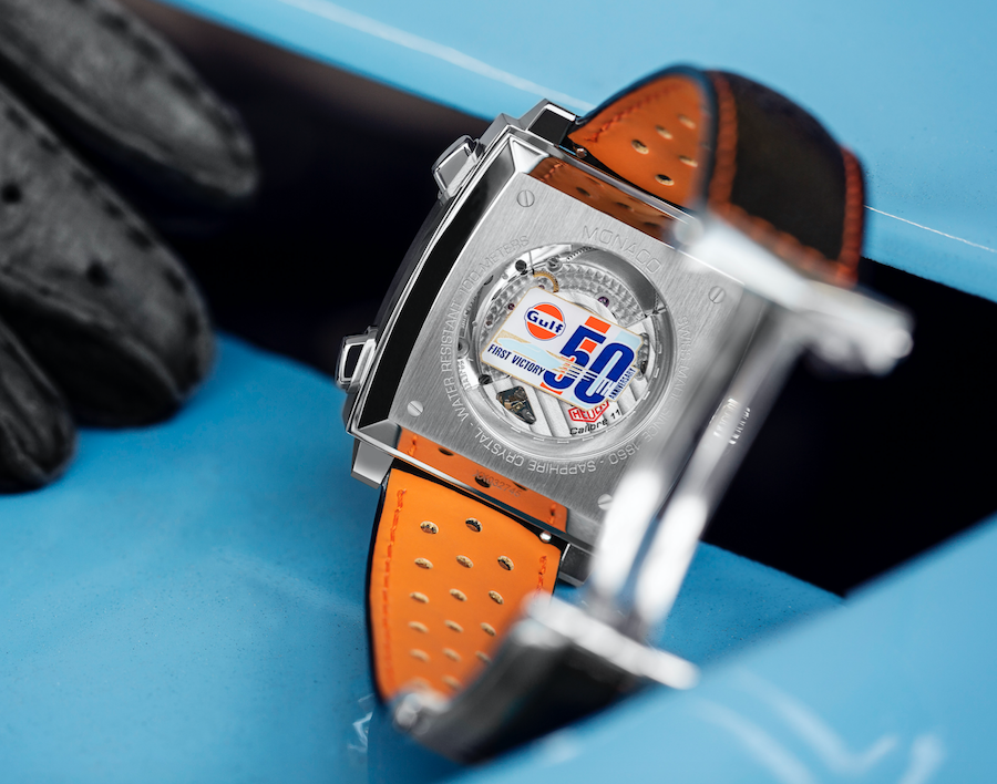 Al mismo tiempo de formar parte esencial de la medición del tiempo, TAG Heuer presentó una nueva Edición Especial Limitada a 50 ejemplares del Monaco Gulf. Este modelo que se caracteriza por tener una caja de 39 mm con el logotipo del aniversario de Gulf, guarda en su interior un movimiento de manufactura Calibre 11 con cronógrafo automático.