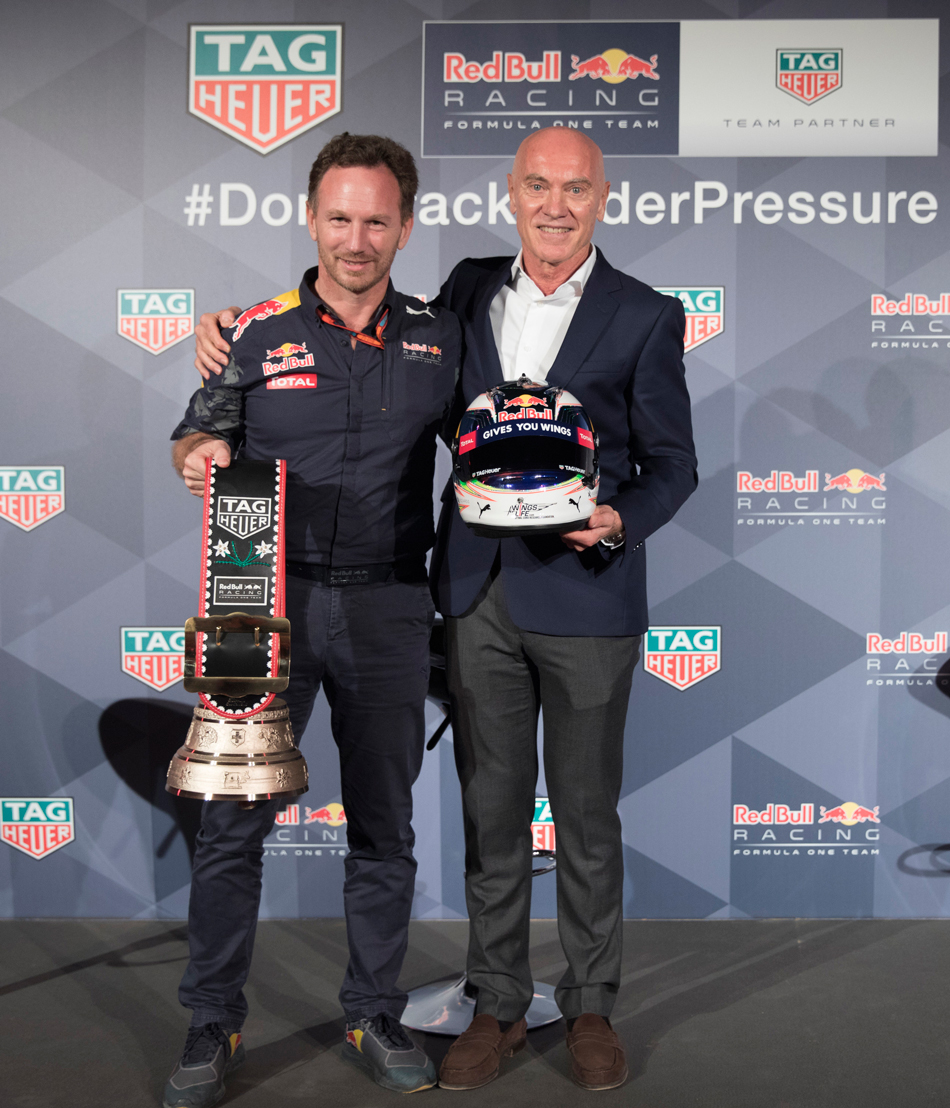 “Me complace haber prorrogado nuestra asociación con TAG Heuer. TAG Heuer y Red Bull Racing son dos marcas que comparten la misma pasión por las carreras y el mismo compromiso por hacer las cosas de forma diferente, y esta es la base de nuestra asociación. El lema de TAG Heuer ‘Don’t Crack Under Pressure’ es algo que en Red Bull Racing vivimos cada día, por lo que deseamos contribuir con TAG Heuer para seguir repitiéndolo en las próximas temporadas”: Christian Horner, Director de Red Bull Racing.