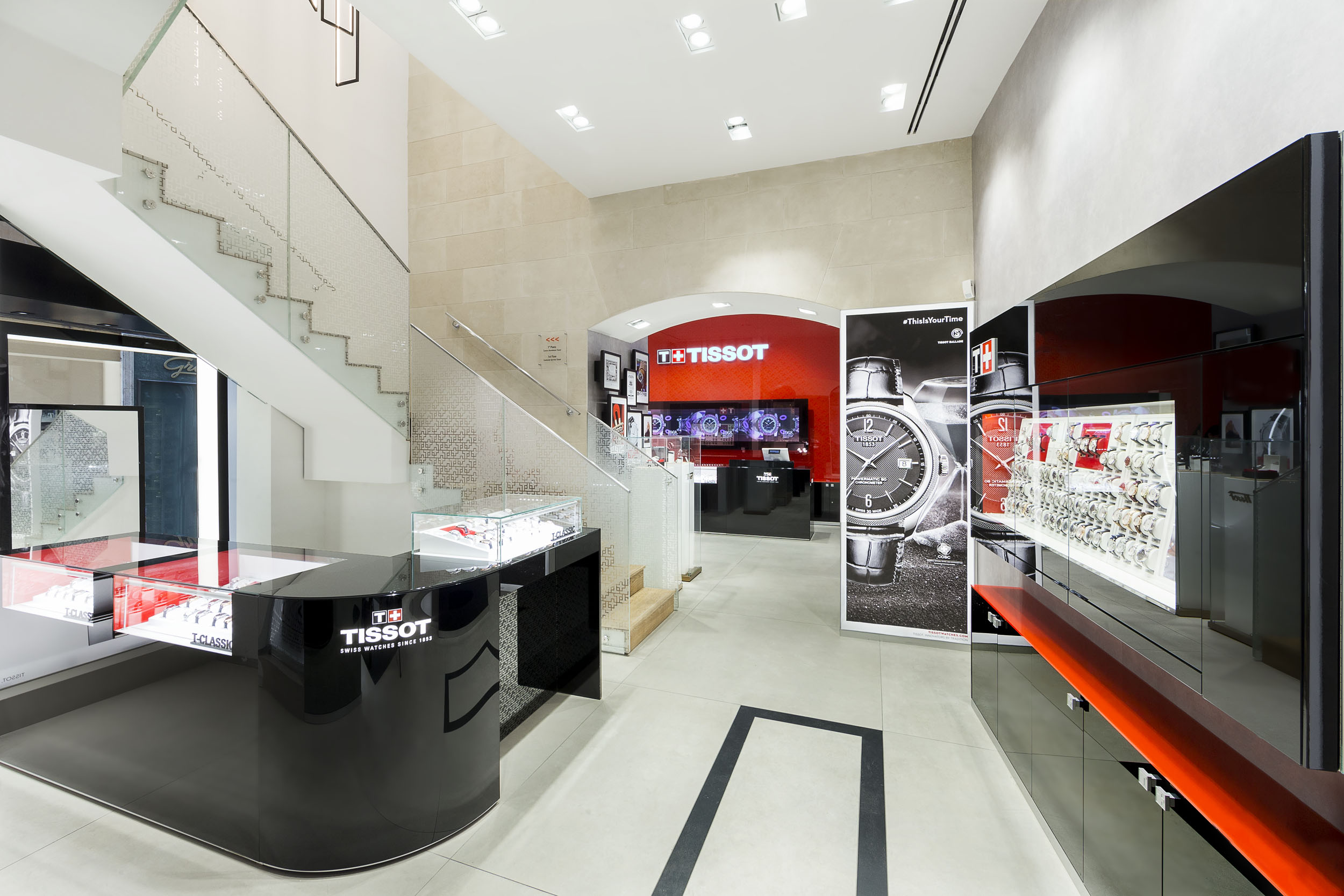 Diseñado mediante una arquitectura que inspira transparencia total, los grandes ventanales están rematados con arcos que dan a la Via del Corso y a la Via della Vite, con ello los peatones pueden admirar la relojería ofrecida por Tissot.