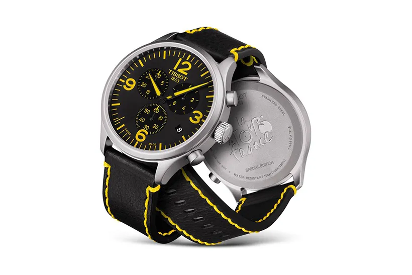 Esta pieza luce una carátula granallada con tres totalizadores para el cronógrafo en color gris y negro respectivamente. Además, posee una escala taquimétrica que ayuda a medir velocidades medias en colaboración con el sistema de cronógrafo. Los pulsadores emulan los protectores de las pedaleras de una bicileta profesional, mientras que el fondo atornillado luce la inscripción-logo del Tour. Finalmente, la pieza se abraza al pulso mediante una correa de caucho con silicón en juego de colores negro y amarillo, al ser este último el emblemático de la competencia.