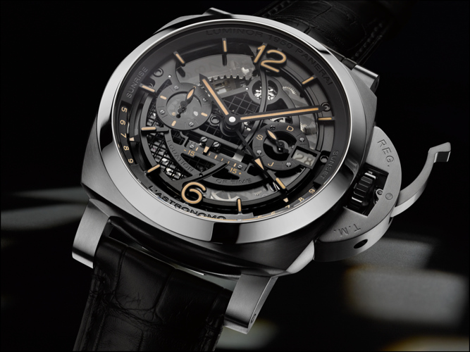 Esencialmente responde a Luminor 1950 Tourbillon Moon Phases Equation of Time GMT, y es uno de los relojes más complicados jamás producidos por la marca. Su movimiento esqueletado P.2005/GLS se personaliza para funcionar de acuerdo a las coordenadas que solicite el cliente, mientras que las fases de la Luna, la Ecuación del Tiempo y el GMT pueden ser ajustados desde la corona, un verdadero hito de la mecánica.