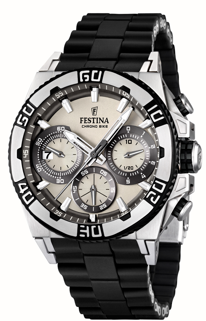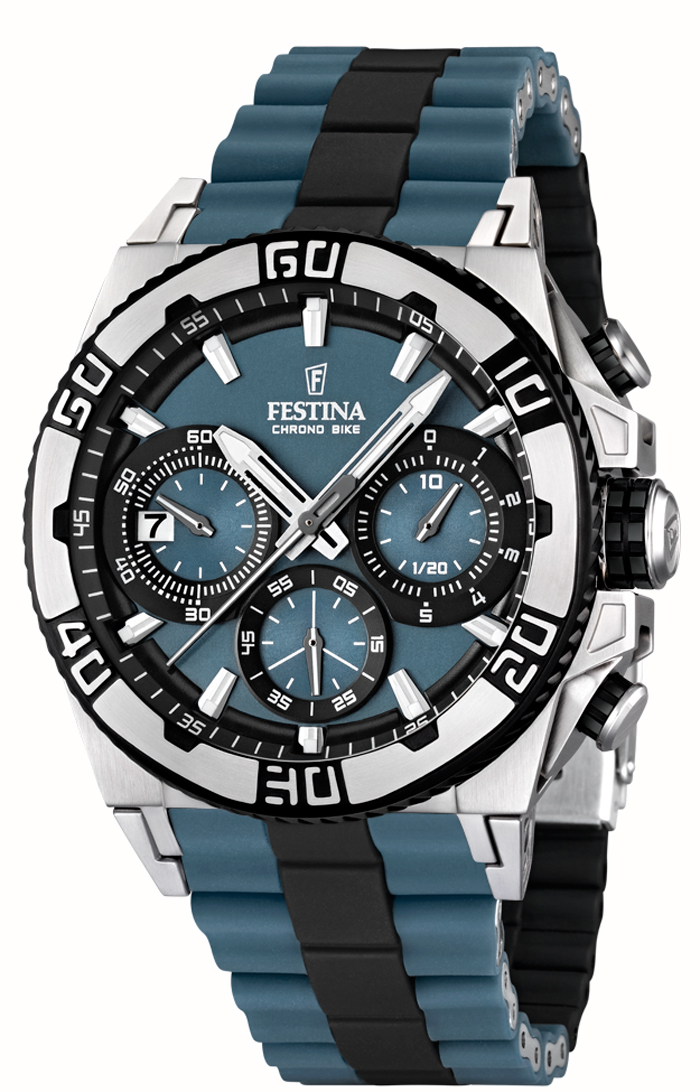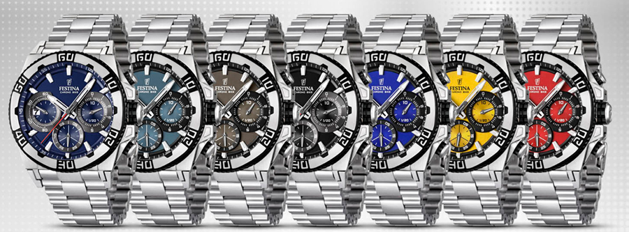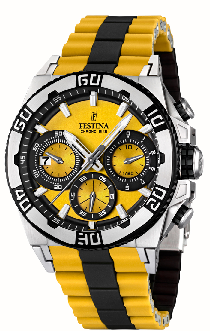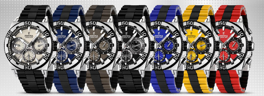 Festina se inspira en el mundo del ciclismo de la más alta competencia para develar una colección de 16 cronógrafos ideales para el hombre masculino, deportista y competitivo. Diseñado a partir de un tamaño de caja de 45 mm de diámetro, su apariencia deportiva se ve realzada por el bisel dentado, cuyos índices y sub–carátulas recuperan la inspiración en el diseño de una bicicleta, específicamente en los elementos conocidos como: piñones, plato de cambio y, claro, las ruedas.