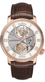 Aí la Manufactura de Le Brassus asocia el tourbillon al carrusel, dos complicaciones emblemáticas de la marca para proponer un modelo de excepción dotado de un tourbillon volante a las 12h00, de un carrusel volante a las 6h00 y de un calendario a las 3h00. Las miradas quedan inmediatamente impactadas por las diferencias y similitudes de ambos mecanismos así como por la belleza de su rotación. Las dos jaulas, independientes la una de la otra, están unidas por un diferencial que transmite el promedio de marcha de los dos regula- dores a la visualización de las horas. Una corona de armado exterior permite el armado simul- táneo de los dos barriletes al tiempo que garantiza un armado igual, dando a este guardatiem- pos toda su precisión y siete días de reserva de marcha. El fondo de cristal de zafiro permite entrever este ingenioso mecanismo al igual que la indicación de la reserva de marcha.