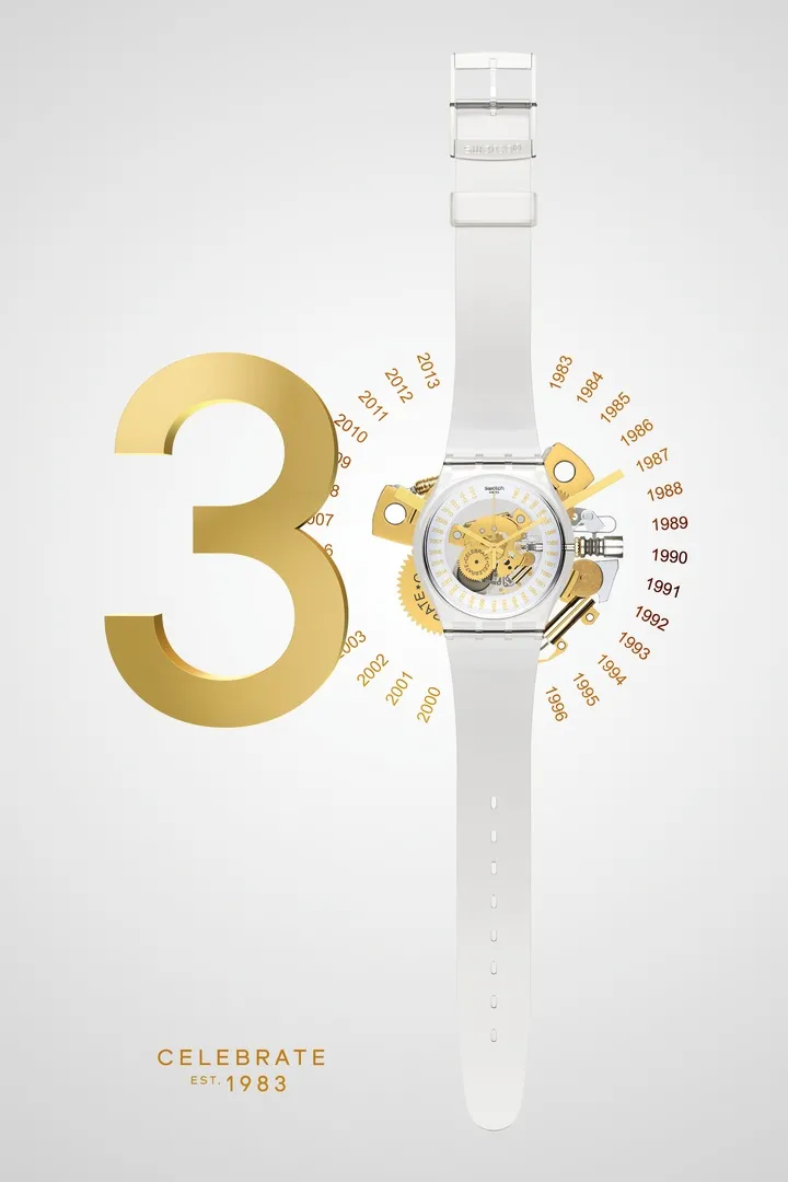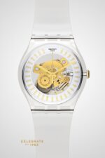 Tras tres décadas de astuto ingenio, audaz innovación, traviesa provocación e inagotable alegría, Swatch tiene mucho que celebrar. A aquellos primeros les siguieron millones de ellos, pero hoy hay uno que honra la existencia de todos ellos, se trata de un New Gent con caja y correa de plástico transparente y una carátula en la que se ve claramente el movimiento interior.