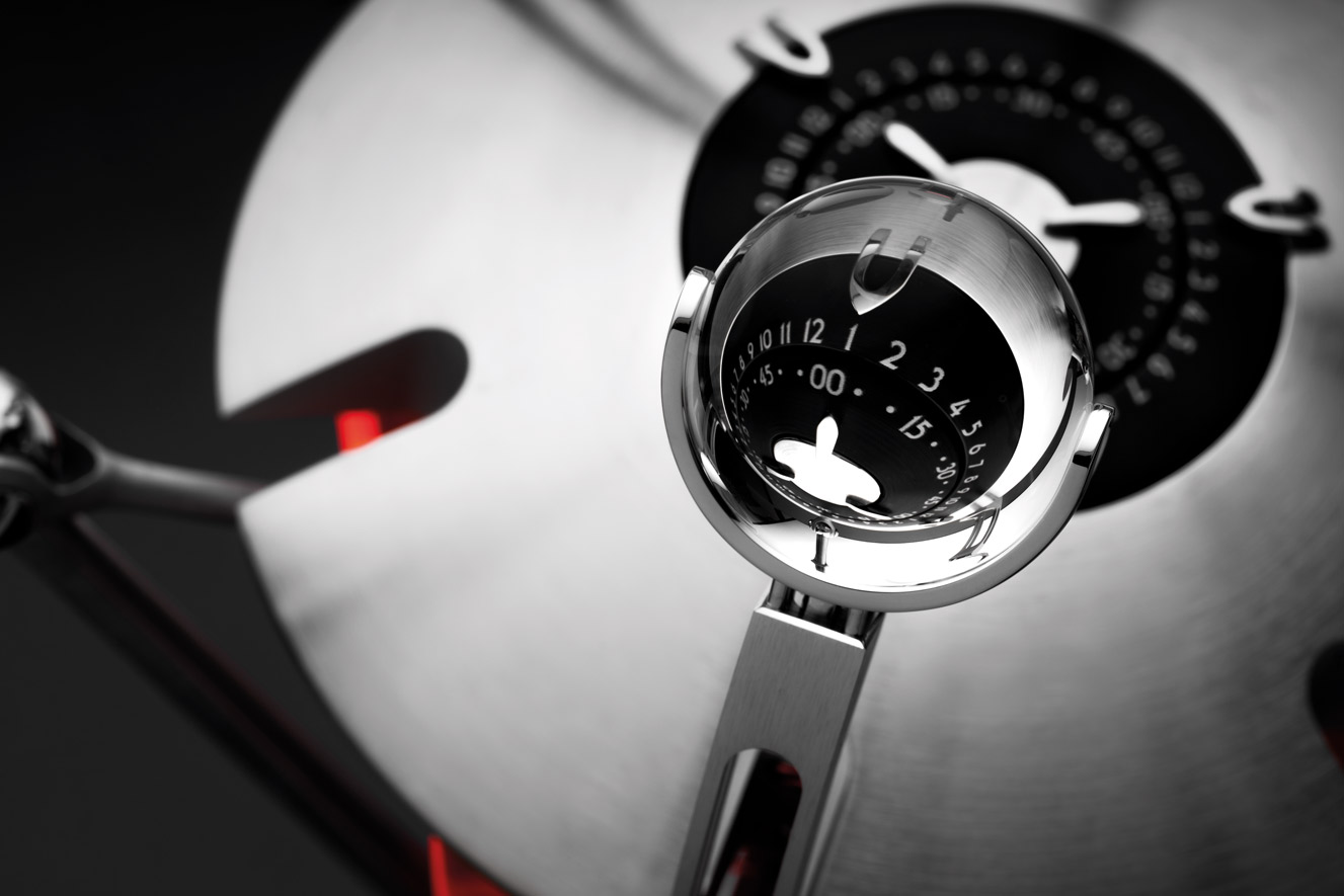 Una función esencial de Trinity es indicar la hora, que se puede ver mirando la esfera compuesta por discos giratorios. Sin embargo, este reloj requiere cierta interacción entre el hombre y la máquina: el observador lee la hora gracias a tres esferas ópticas. Cada una aumenta los números del reloj y los hace legibles.