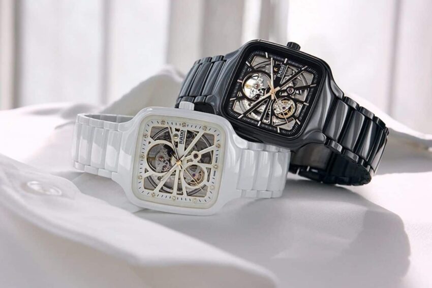 Uno de los modelos favoritos de los fanáticos de Rado es sin duda el True Square Open Heart, un reloj que ha logrado reinterpretarse una y otra vez. Para este 2022 se muestra con detalles futuristas y agujas de color oro rosa tanto para dama como para caballero.