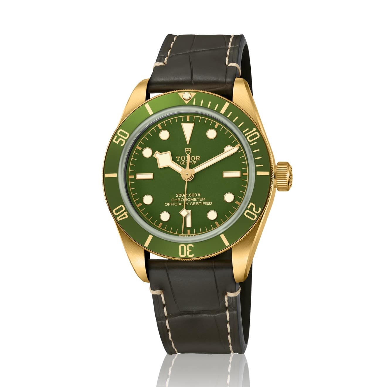 - Correa: abombada de cuero de aligátor marrón oscuro con cierre de hebilla de oro amarillo de 18 quilates; correa adicional de tejido verde con una banda dorada y cierre de hebilla de oro amarillo de 18 quilates, incluida en el estuche