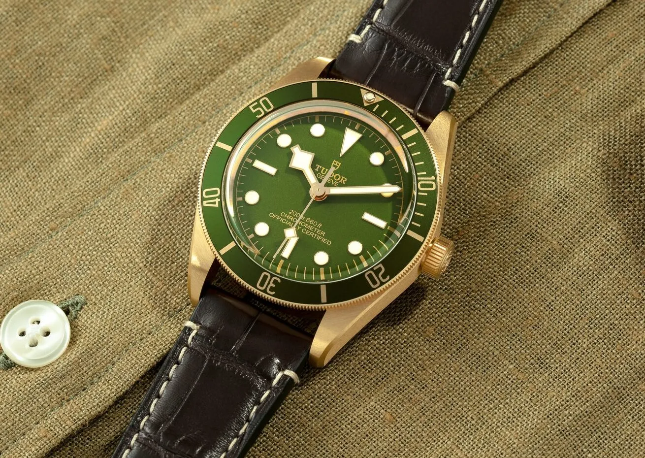 El Black Bay Fifty-Eight 18K luce, además, las características más bellas de los relojes Tudor de submarinismo, como las agujas Snowflake, y la infaltable correa de tejido Jacquard que se ha popularizado en la marca. También se incluye una strap en piel de cocodrilo color marrón oscuro.
