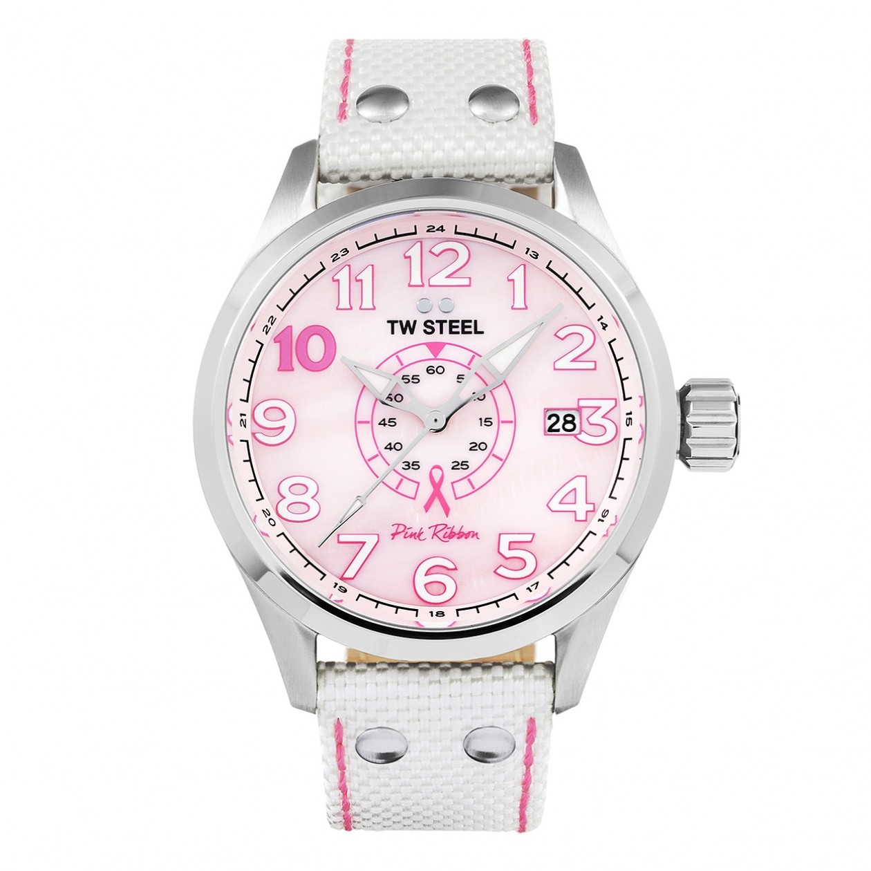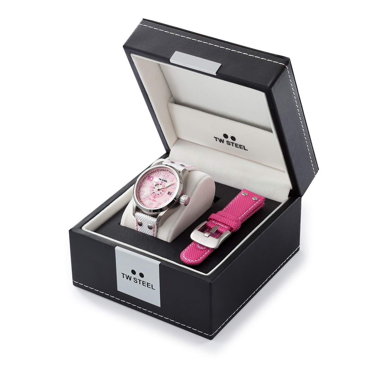 El número 10 rosa en el cuadrante destaca el décimo mes del año: octubre, el mes de concientización sobre el cáncer de mama. El TW972 combina esto con una esfera de nácar rosa y una correa textil blanca con costuras de color rosa. El TW973, por otro lado, tiene una esfera negra y una correa textil negra con costuras rosadas. Ambos modelos se pueden entregar en una caja de CEO con una correa textil rosa extra.