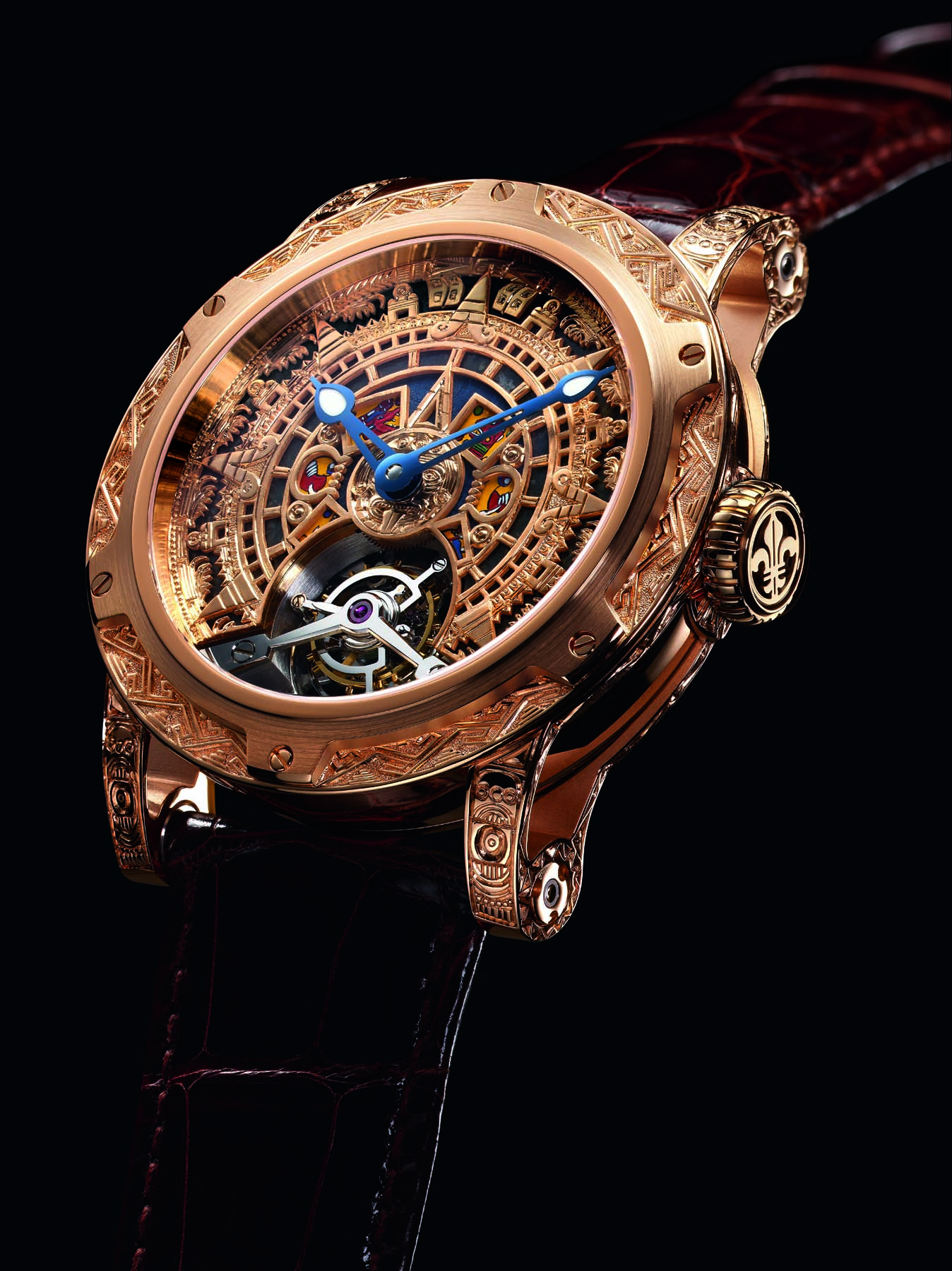 Una pieza única que rinde homenaje a las raíces de la cultura mexicana. Los talleres Louis Moinet recabaron minuciosamente información y buscaron los materiales más típicos del país, y luego los combinaron en esta creación espectacular y original. Un aspecto destacado es la presencia del material más antiguo conocido en el mundo, el meteorito Allende, que se encuentra en el estado de Chihuahua.