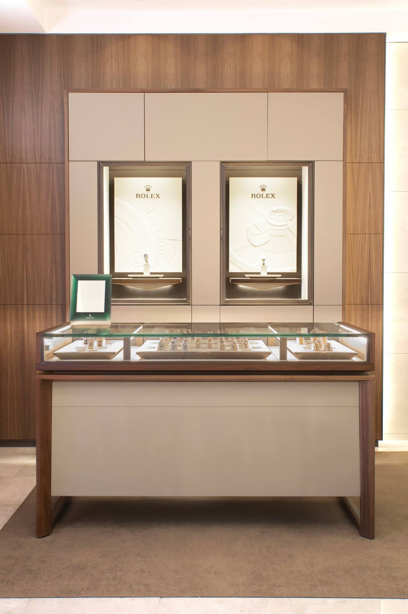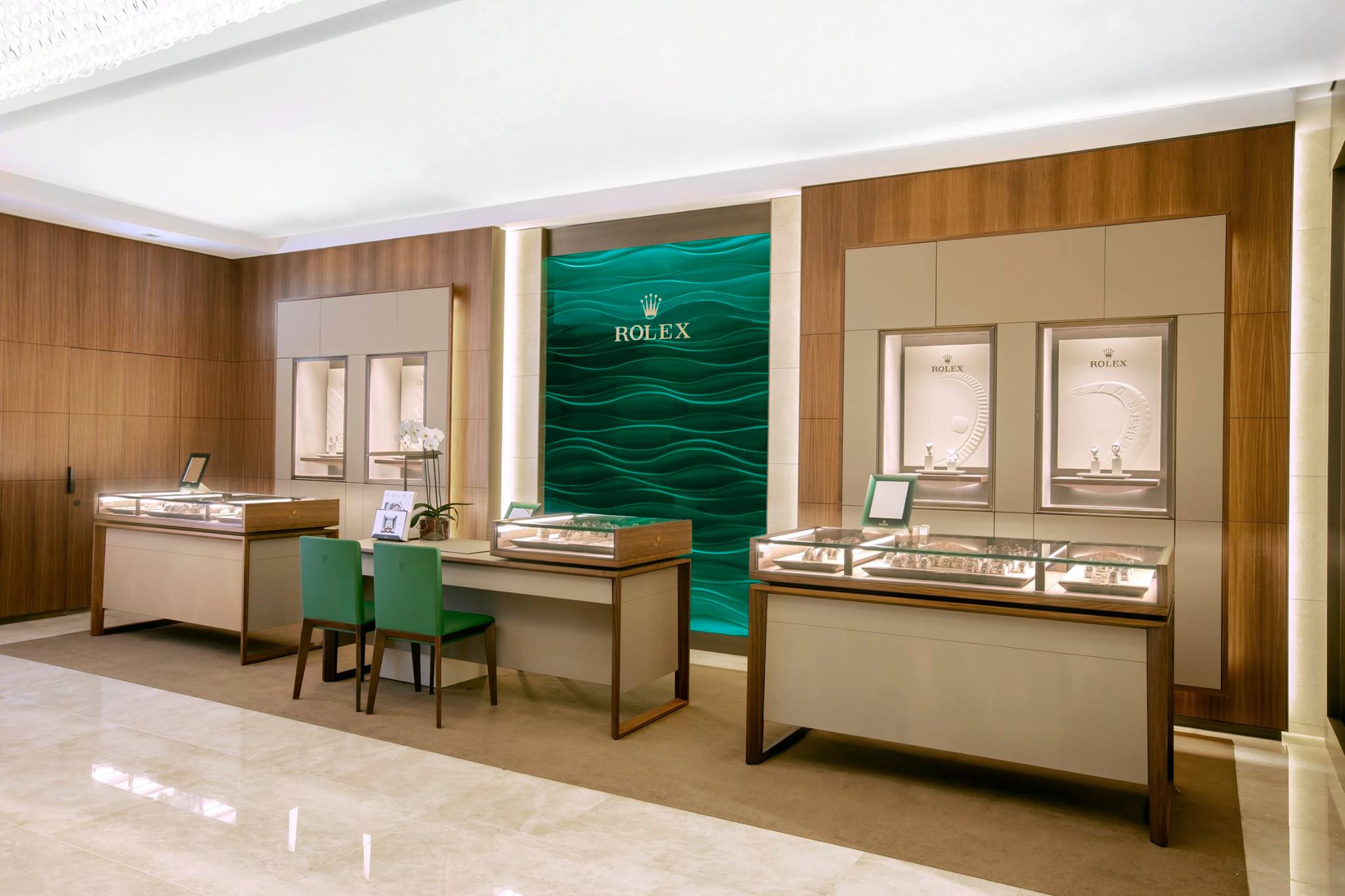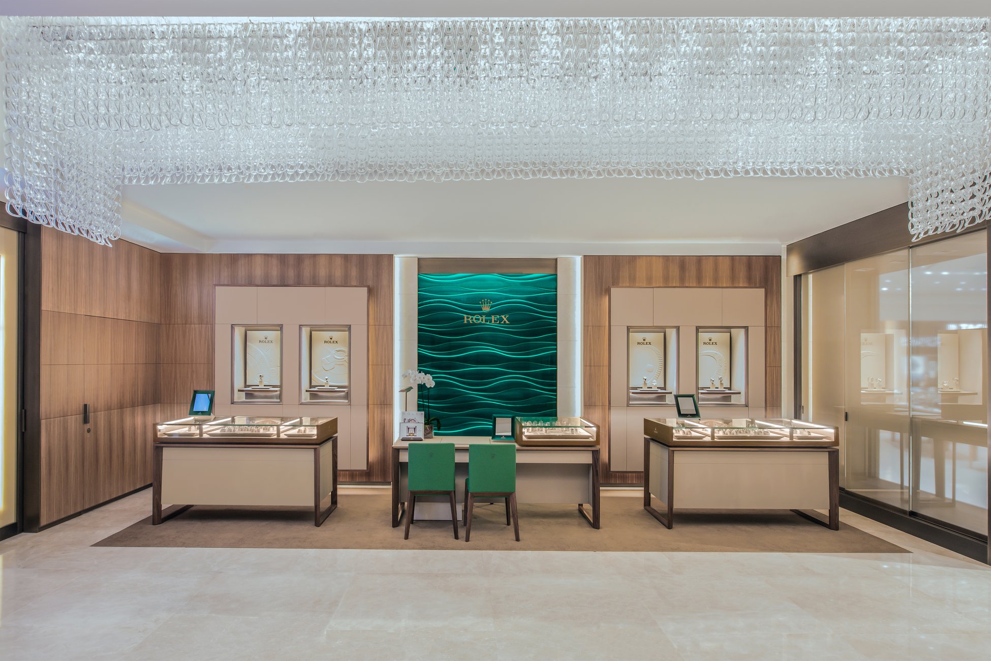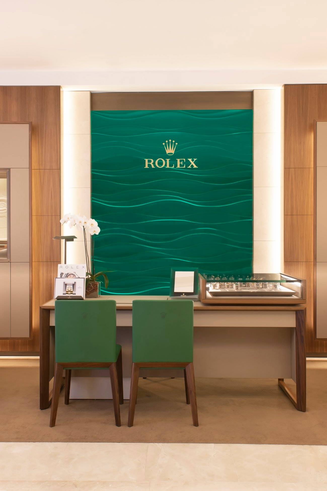 En este universo Rolex destaca la exuberante pared iluminada Aqua, distintiva de los espacios destinados a la marca. El diseño general destaca elementos de elegancia distintiva. La luz suave, los marcos de latón, las sillas de cuero color verde y el mobiliario hecho de nogal, forman parte de este incomparable ambiente. De la misma manera, el símbolo que preside la excelencia, la corona dorada de Rolex, complementa el entorno distinguido. Finalmente, la sala de exhibición proporciona una gran experiencia a los visitantes del espacio, reflejando los estándares excepcionales de la marca a partir de los relojes presentados.