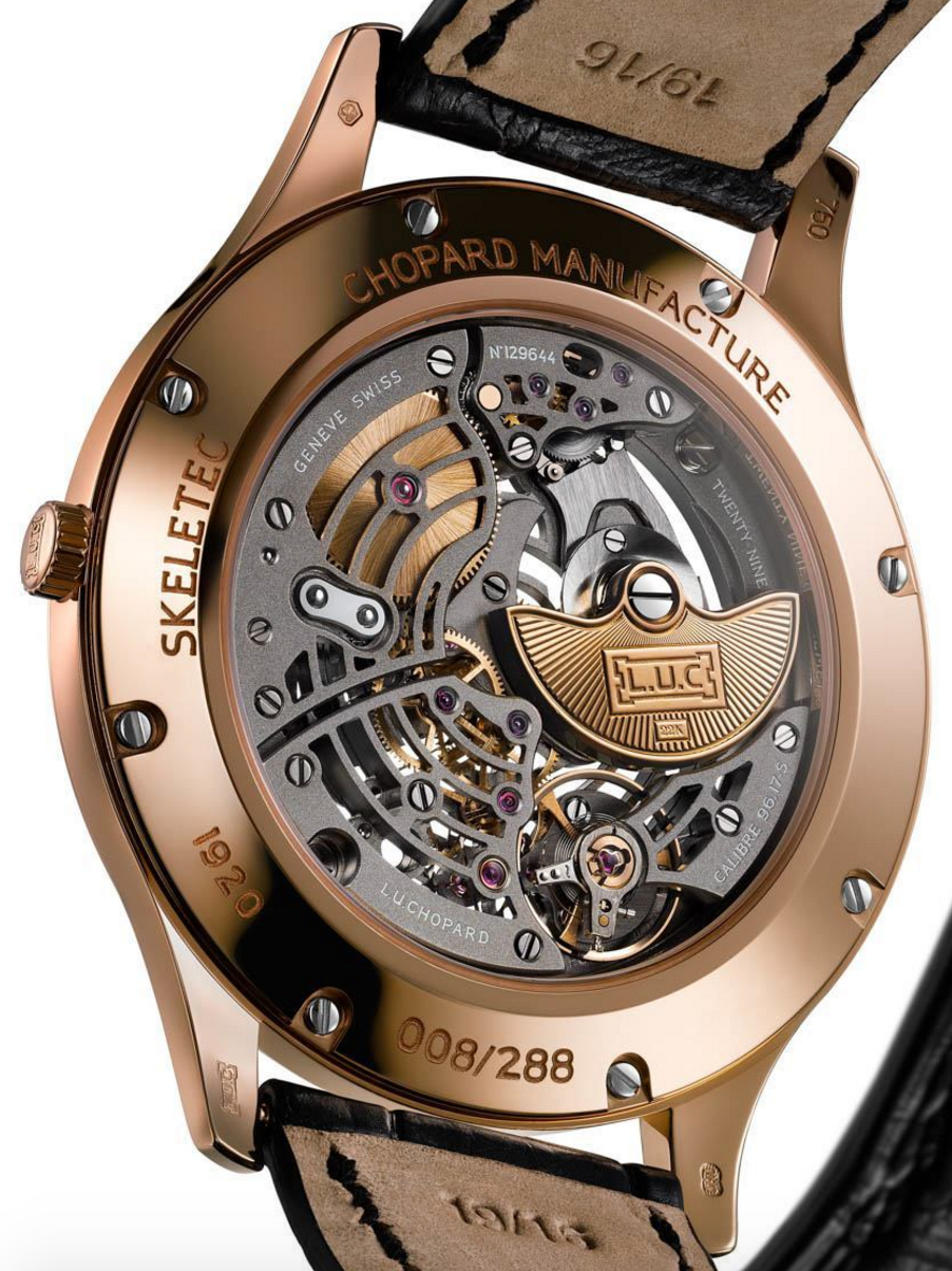 Inspirado en el primer calibre esqueletado de la firma, esta referencia en oro rosa de 18 quilates se aloja dentro de una caja ultraplana con un grosor de 6.98 mm y una carátula abierta que revela el mecanismo de carga automática L.U.C 96.17-S. Su frecuencia de 4 Hz garantiza fiabilidad y precisión a cada una de las 288 piezas de edición limitada.