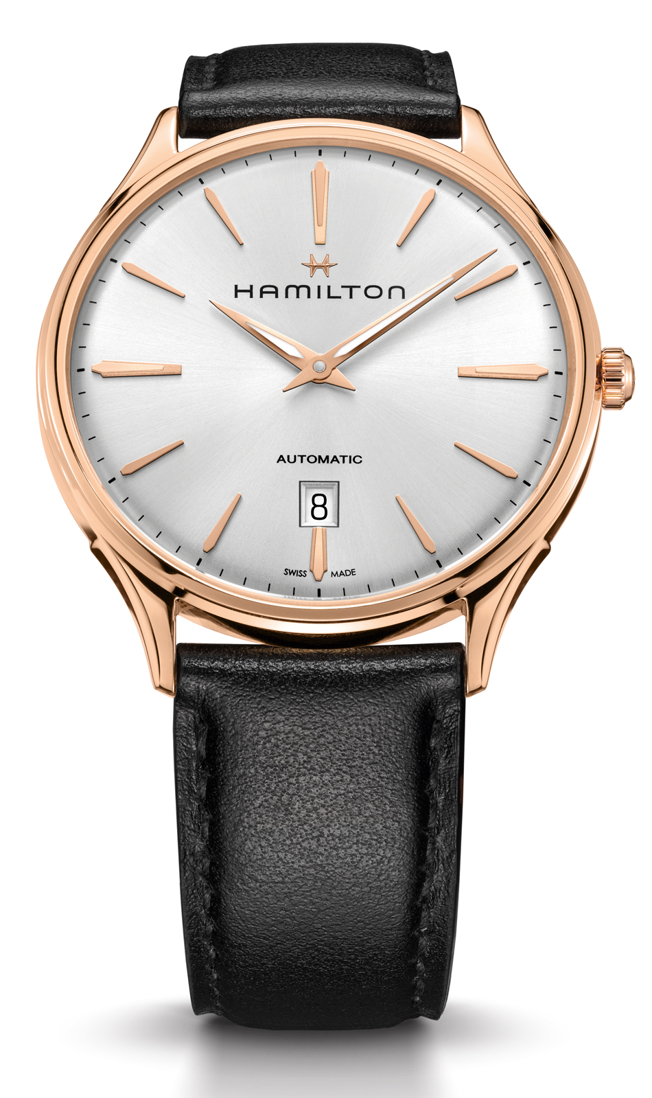 En esta ocasión, Hamilton marca historia con el Jazzmaster Thinline Gold gracias a su caja de oro rosa de 18 quilates con diámetro de 40 mm. El mecanismo automático con calibre 2892-2 muestra la indicación del tiempo y la fecha, mientras que las manecillas áureas tipo dauphine con tratamiento luminiscente destacan dentro de la carátula curvada con índices aplicados.