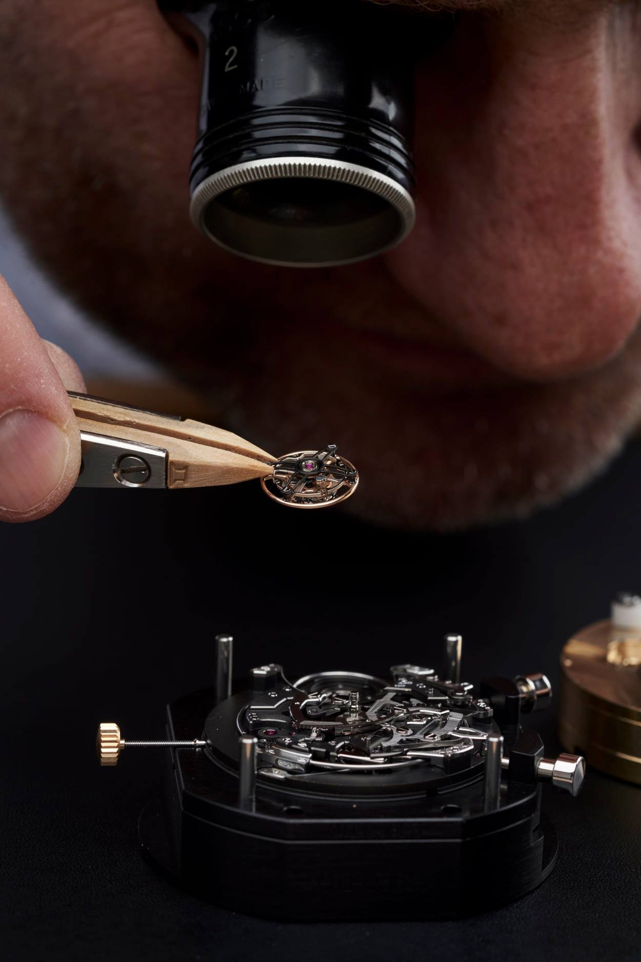 La maravilla se acciona al presionar el pulsador ubicado a las 10 horas, que activa el mecanismo impulsado por un barrilete independiente. El contador de horas y el regulador de inercia comienzan a girar; los martillos, visibles en una abertura hecha a las 12 horas, golpean el gong, cuya forma ha sido sutilmente trabajada para sortear la jaula del tourbillon volante.