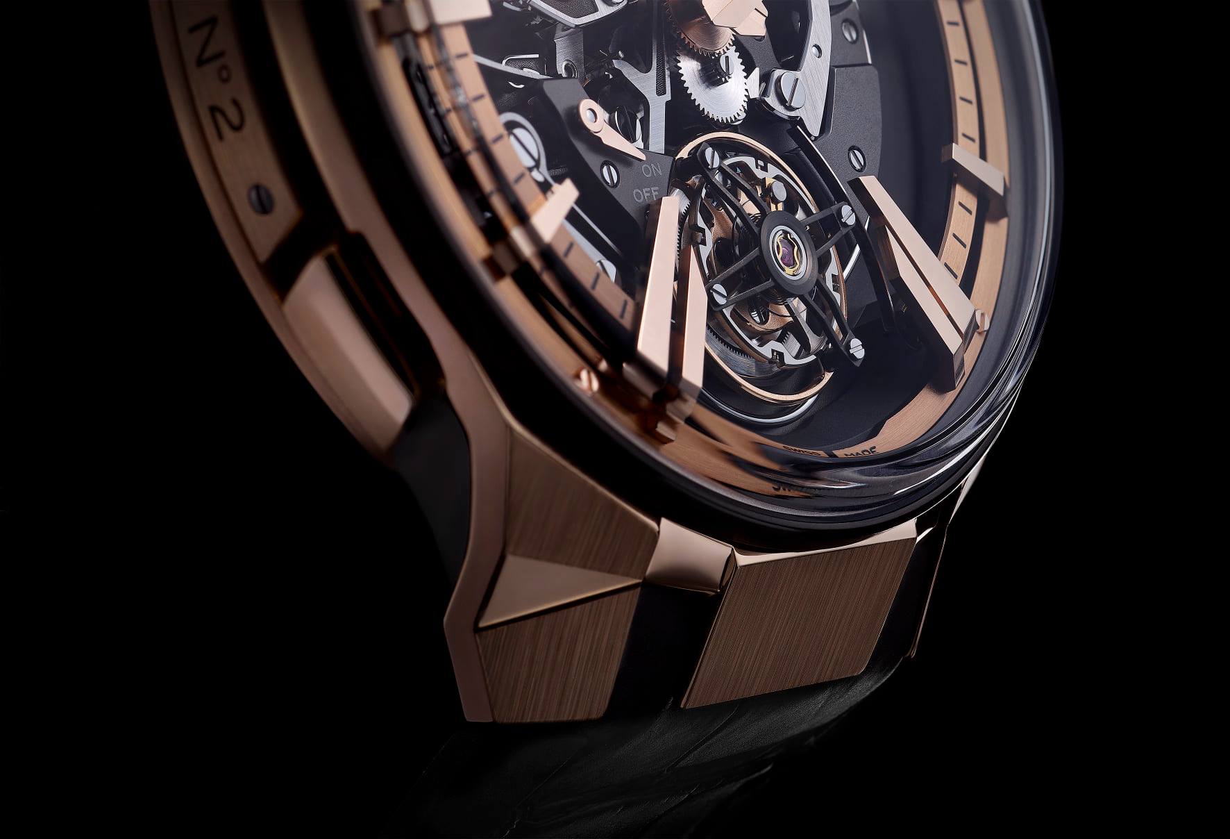 - Caja: 45 mm de oro rosa de 18 quilates con carrura de titanio con recubrimiento DLC negro; cristal de zafiro por ambos lados
