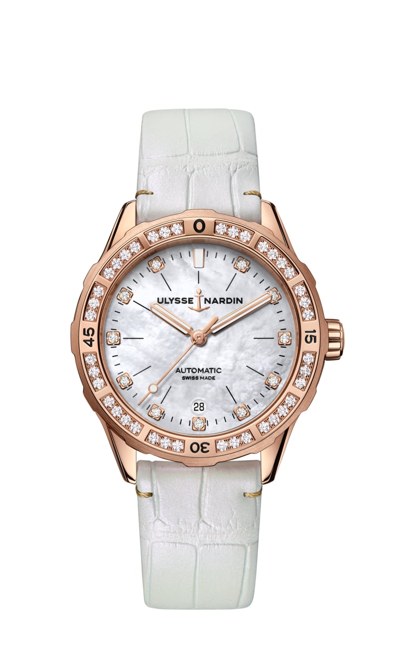 Está engastado con 40 diamantes, con un total de 80 quilates, que brillan intensamente bajo el sol del mediodía. Con todas las características de un clásico Diver de Ulysse, este reloj es una prueba de que no se puede juzgar un libro por su portada y que la belleza está en el interior. Dentro de la impresionante caja se encuentra el potente calibre UN-816, un movimiento automático que funciona a 28.800 alt/h (4 Hz ). La esfera de nácar tiene 11 diamantes, con un total de 0,12 quilates, y la correa de piel de aligátor blanca se ajusta mediante una hebilla de oro rosa 5N. Este es un reloj para personas que aprecian la estética del diseño depurado pero que no tienen miedo de enfrentarse a lo desconocido en nombre de la aventura.