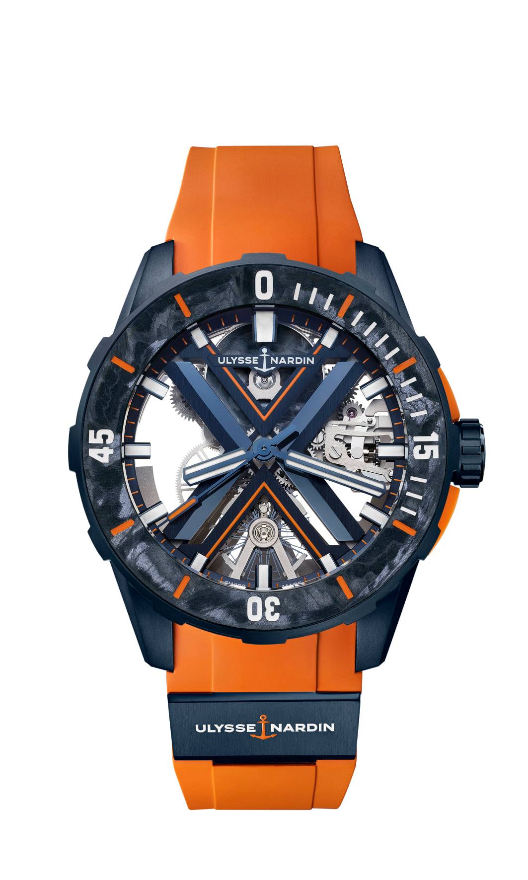 El Diver X Skeleton viene con una correa de caucho en azul océano o naranja con un elemento adornado con el ancla Ulysse Nardin también en naranja. Un recordatorio constante de que Ulysse Nardin siempre ha gobernado las olas mirando a las estrellas.