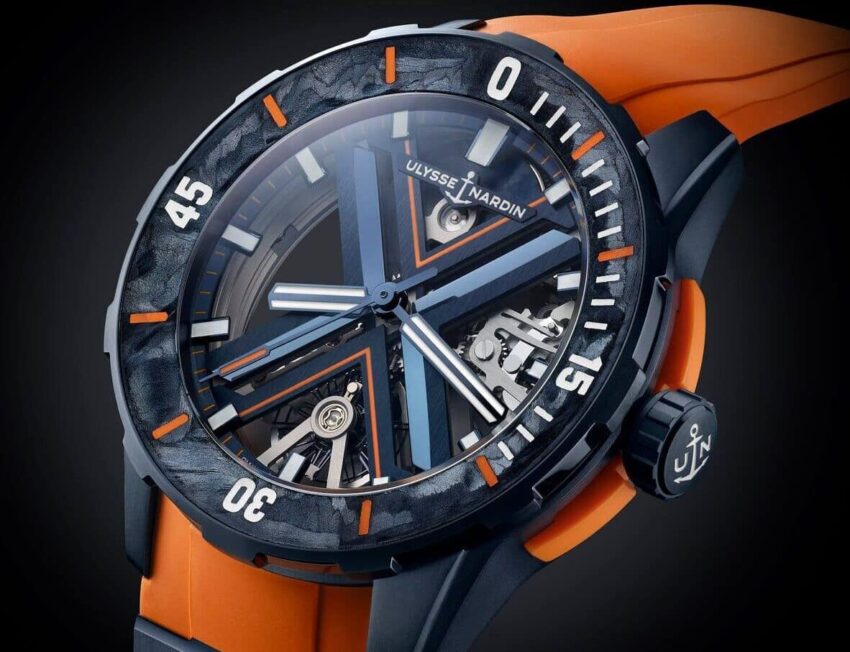 El equipo de ingeniería ha rediseñado por completo el movimiento UN-371, que es visible a través de la caja de 44 mm. Originalmente diseñado para la colección Executive Skeleton, se ha mejorado con la adición de una masa oscilante en forma de la icónica X de Ulysse Nardin. También hay una tapa del barrilete situada a las 12 horas con Carbonium azul, el mismo material empleado para el bisel, y las agujas de horas, minutos y segundos están recubiertas con SuperLumiNova, por lo que no tendrá problemas para leer la hora bajo el agua.