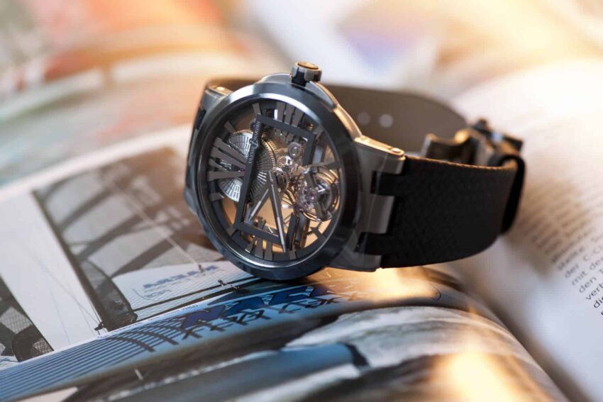El nuevo Executive Skeleton Tourbillon se viste de cerámica azul y titanio, destacando que lo tiene todo: una estampa que impone gracias al clasicismo de su línea ejecutiva, es decir: caja de titanio con cerámica azul de 45 mm de diámetro abrazada a la muñeca mediante una correa de piel tratada con un revestimiento entretejido para maximizar su durabilidad. Sin embargo la genialidad reside en su mecánica…