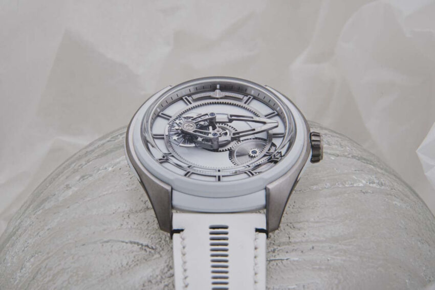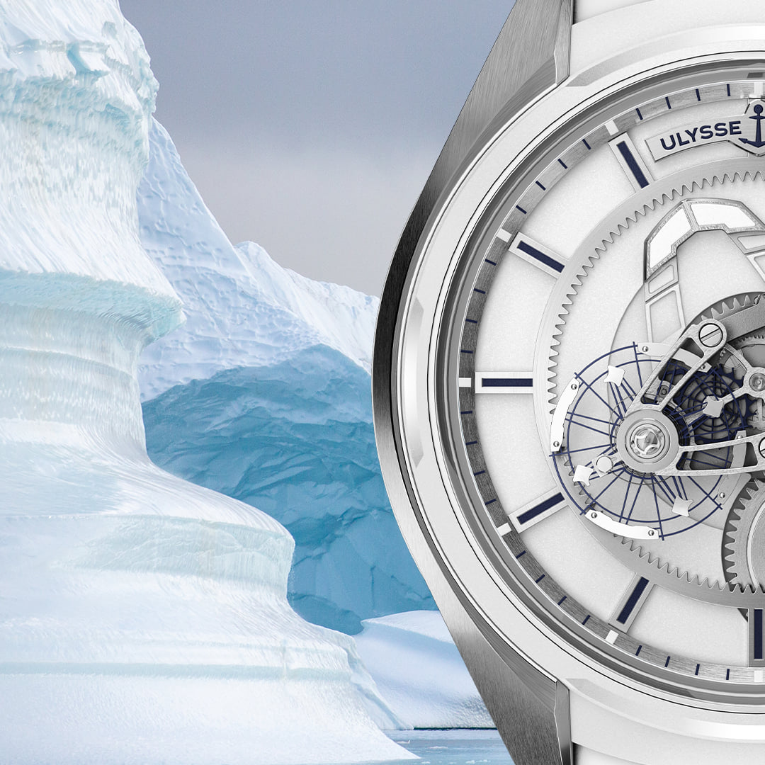 La caja está desarrollada en titanio, por lo que el toque es magistral y hace recordar el azul de los labios cuando nos sometemos a una temperatura tan baja. Asimismo, la correa es de piel blanca con revestimiento de caucho y hebilla desplegable a juego.
