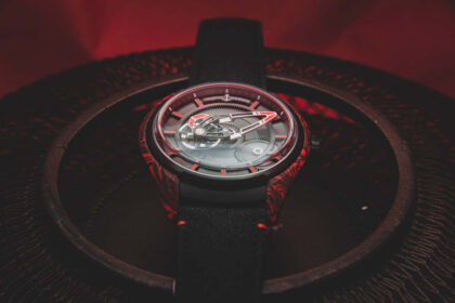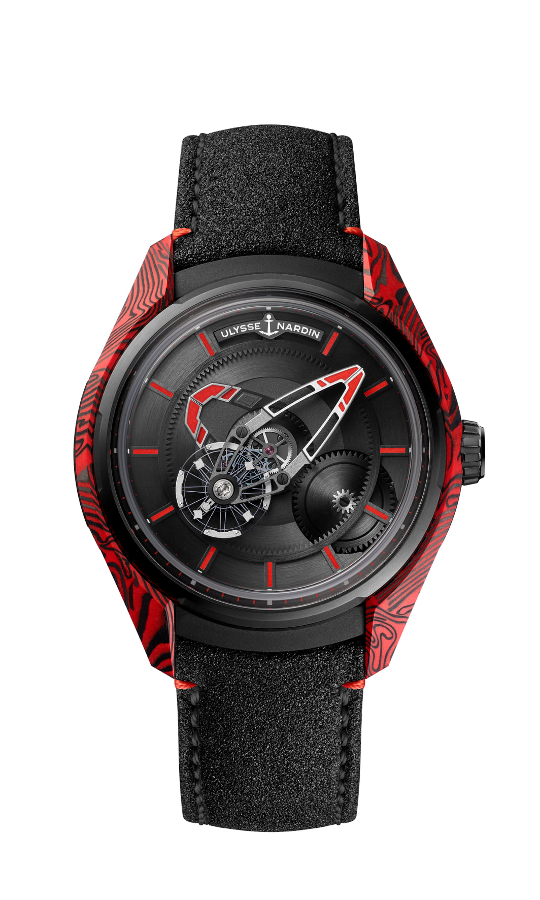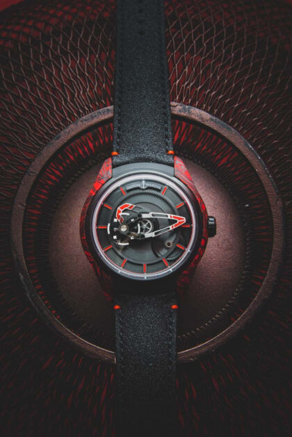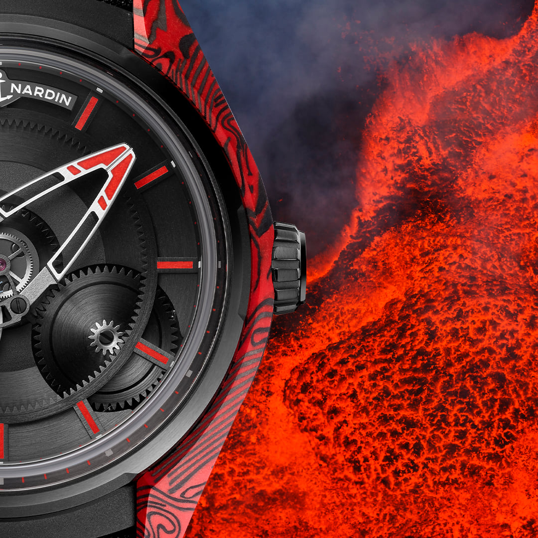 Desarrollado en caja de combinación “sísmica”: fibra de carbono con resina epóxica veteada roja, cada pieza será única e irrepetible. Ultraligero, aerodinámico, versátil, vigoroso y varonil, así lo describe la marca. La pieza evoca la roca volcánica de obsidiana y el color de la lava que lo ha inspirado, mientras que los efectos pulidos arenados en el bisel y la carátula lisa satinada reflejan un entorno volcánico.