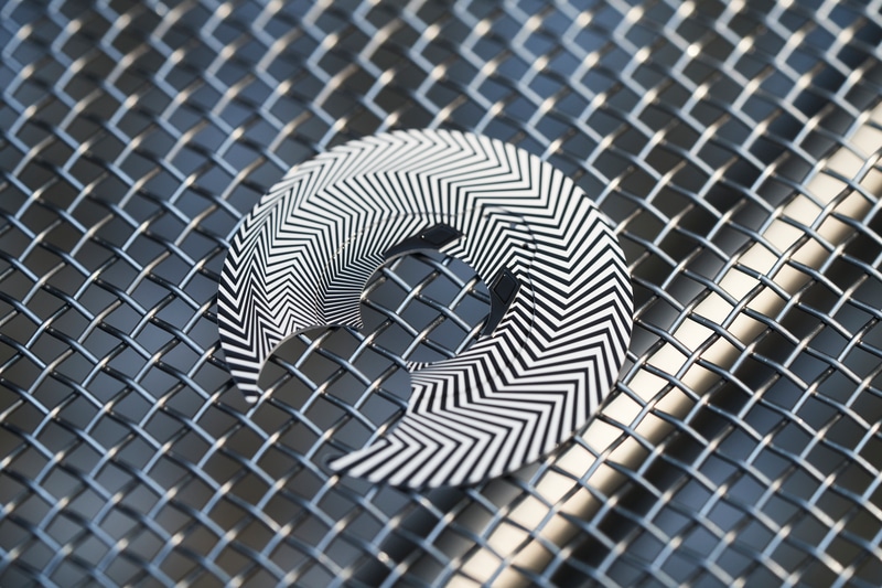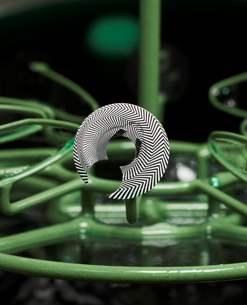 La superficie azulada de la rueda de balance ayuda a romper el diseño monocromático del resto del reloj. El patrón angular en zigzag de rayas de cebra en blanco y negro que le da a este modelo su nombre es menos desorientador que dramático, lo que le da un estilo de arte pop al diseño del Freak X.