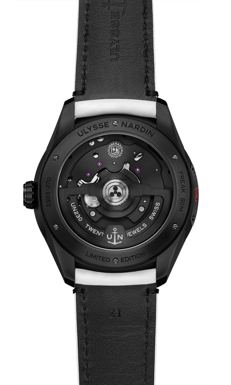 El movimiento automático manufactura Calibre UN-230 está en completa exhibición dentro del Ulysse Nardin Freak X Razzle Dazzle. La vista trasera es muy limpia, ofrece un acabado negro cepillado a través de los puentes de movimiento y el rotor esqueletado luce toques brillantes y pulidos. El rendimiento del Calibre UN-230 totalmente confiable, goza de una reserva de marcha de 72 horas, a 3 Hz.