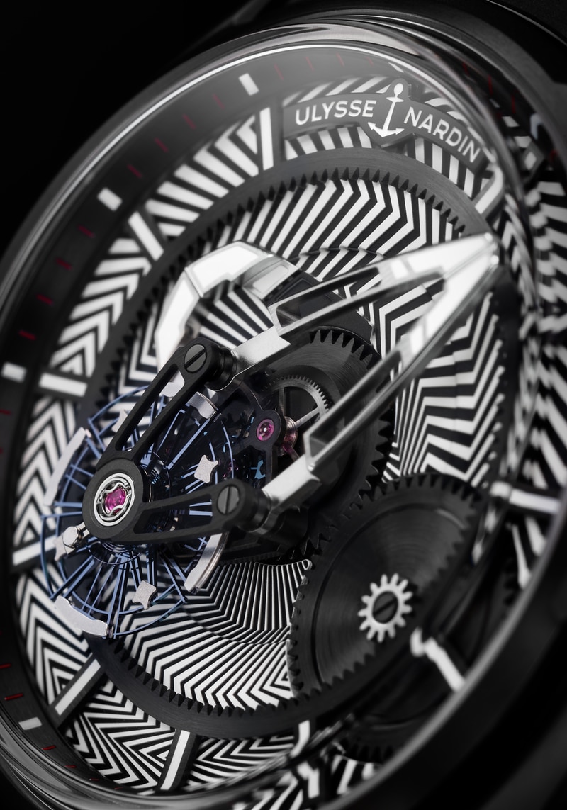La carátula de Ulysse Nardin Freak X Razzle Dazzle es básicamente tridimensional, ya que luce un diseño esqueletizado con layers del movimiento, lo cual permite una visibilidad completa del funcionamiento del movimiento carrusel característico.