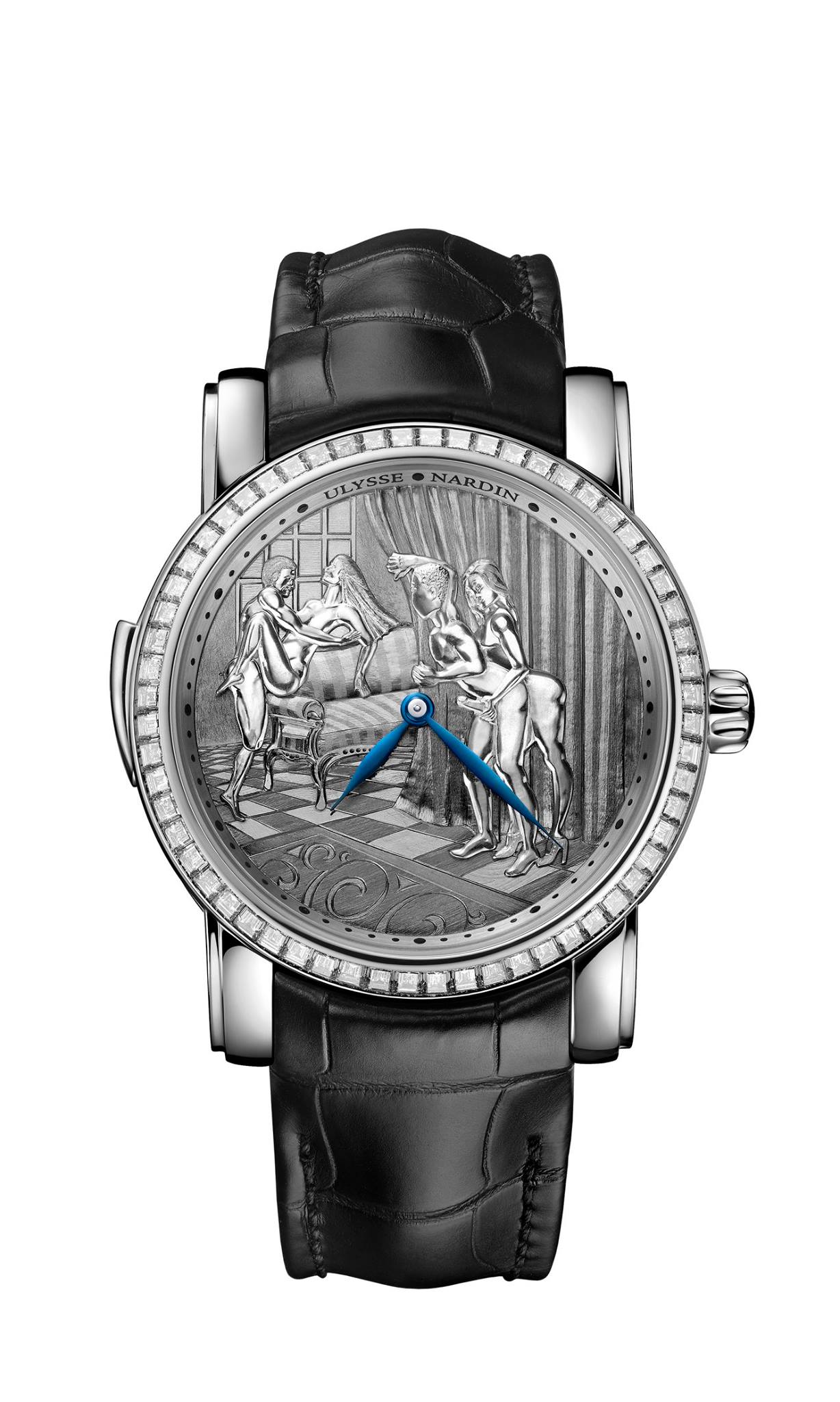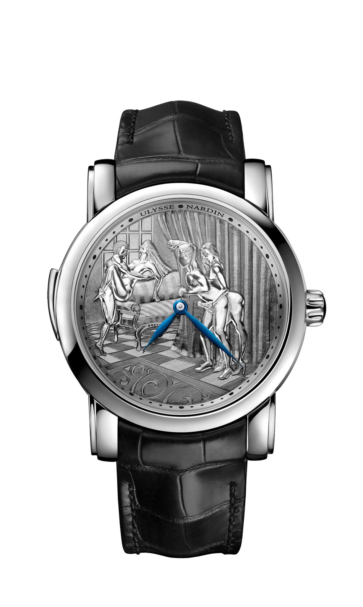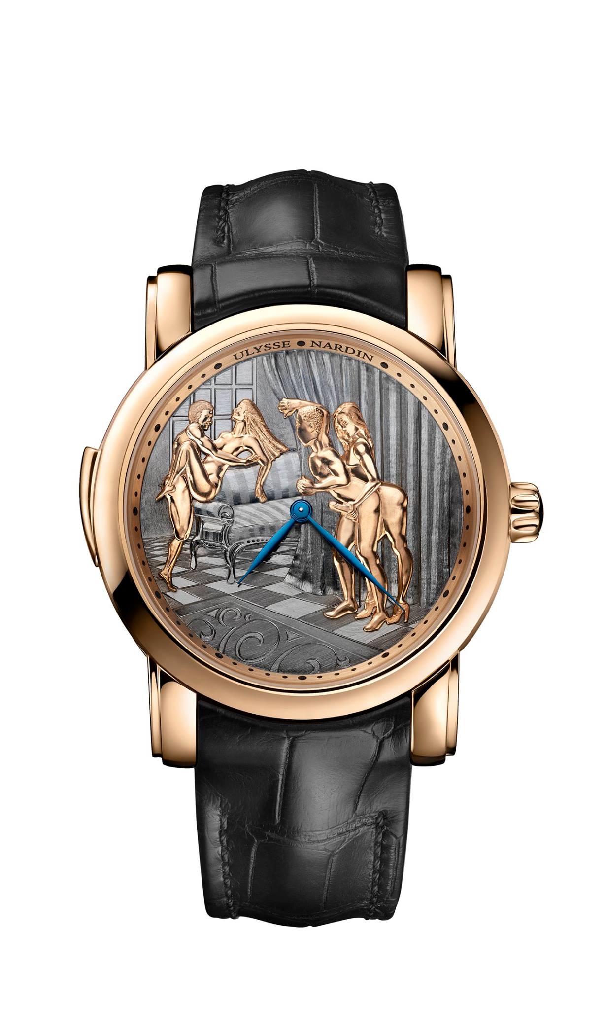 Un autómata de creación sexual que recibe un calibre de repetición de minutos con animación en la carátula. La colección Hot Horlogerie, tres piezas en oro rosa, platino y platino engastado.