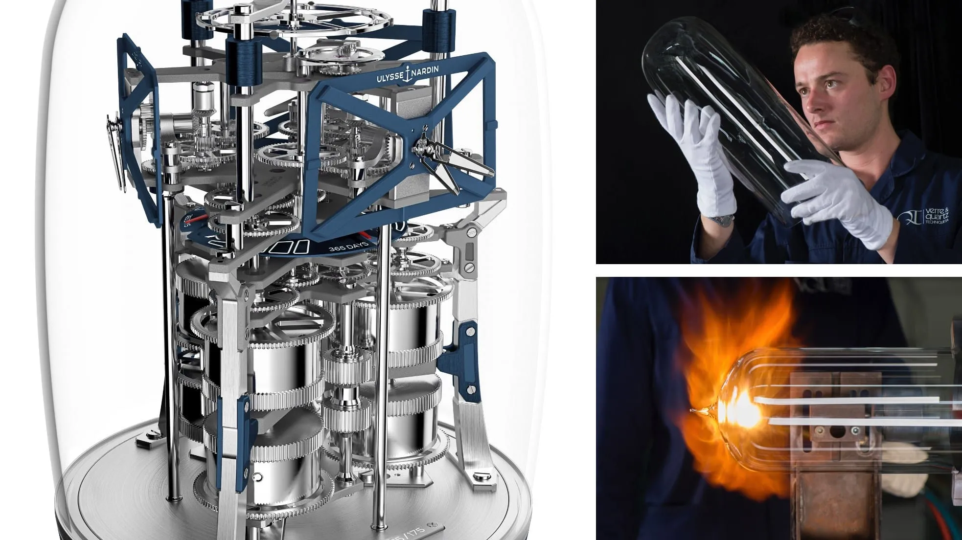 UFO es de por sí suficientemente hipnótico, pero también debe prestarse atención a la campana de vidrio ovoide bajo la que se balancea. Ha sido creada por Romain Montero, un soplador de vidrio artesanal de 26 años que trabaja para Verre et Quartz, un taller técnico de soplado de vidrio ubicado a orillas del lago Neuchâtel de Suiza. Tenía la responsabilidad de hacer a mano cada una de las 75 cubiertas de vidrio OVNI de edición limitada numeradas.