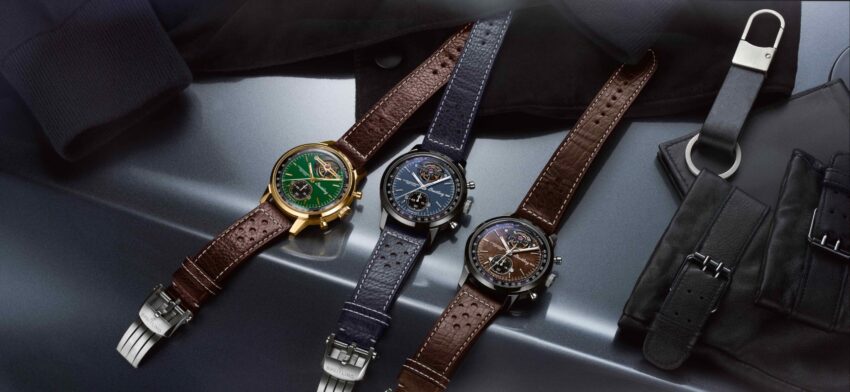 - Correa: modelo Ford Mustang con correa de piel de becerro marrón perforada. Modelo Shelby Cobra con correa de piel de becerro azul perforada. Modelo Chevrolet Corvette con correa piel de becerro marrón.