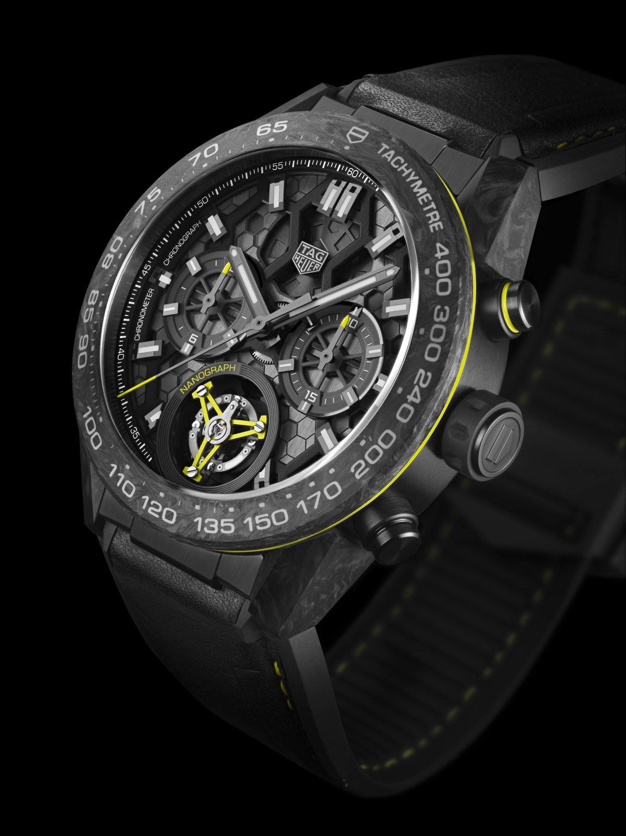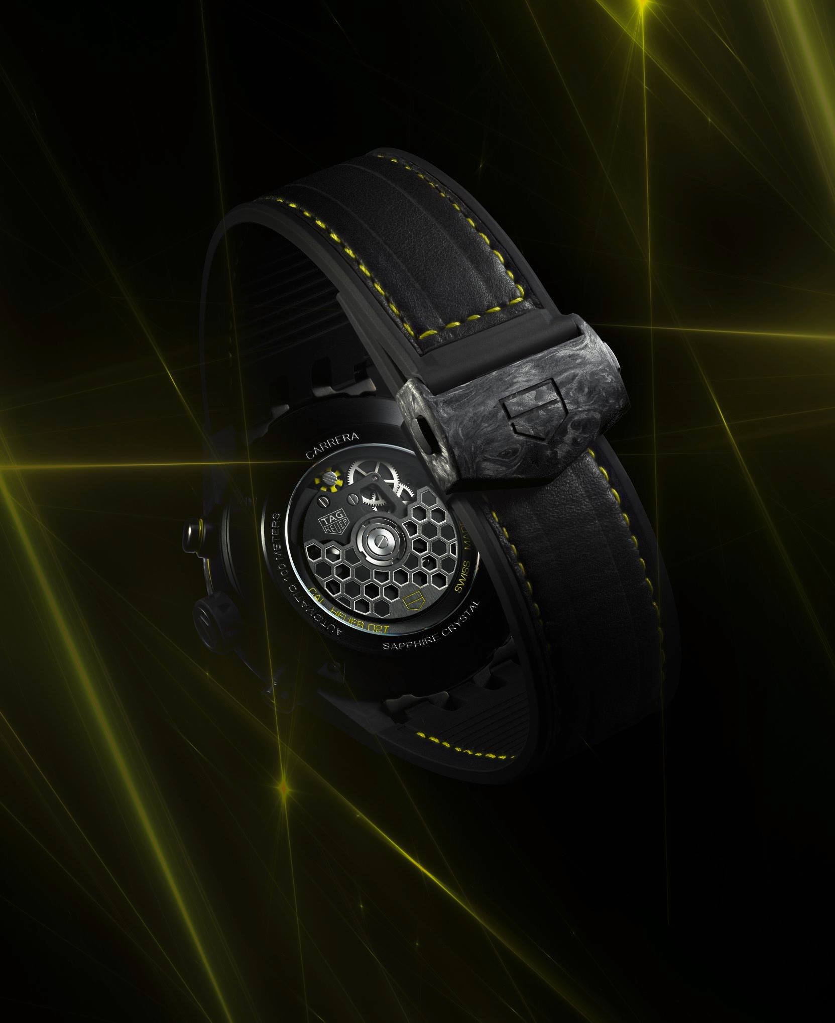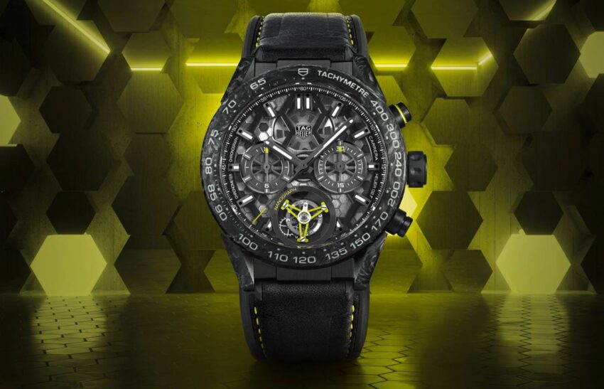 Se trata del primero de los relojes de TAG Heuer que contarán con dicha tecnología, pues podríamos prácticamente asegurar que dicho órgano formará parte de otras colecciones y calibres, como el Heuer 01 Carrera. En esta ocasión, la referencia presenta una caja de carbono y titanio con vivos color amarillo y patrón que replica la estructura molecular del carbono.