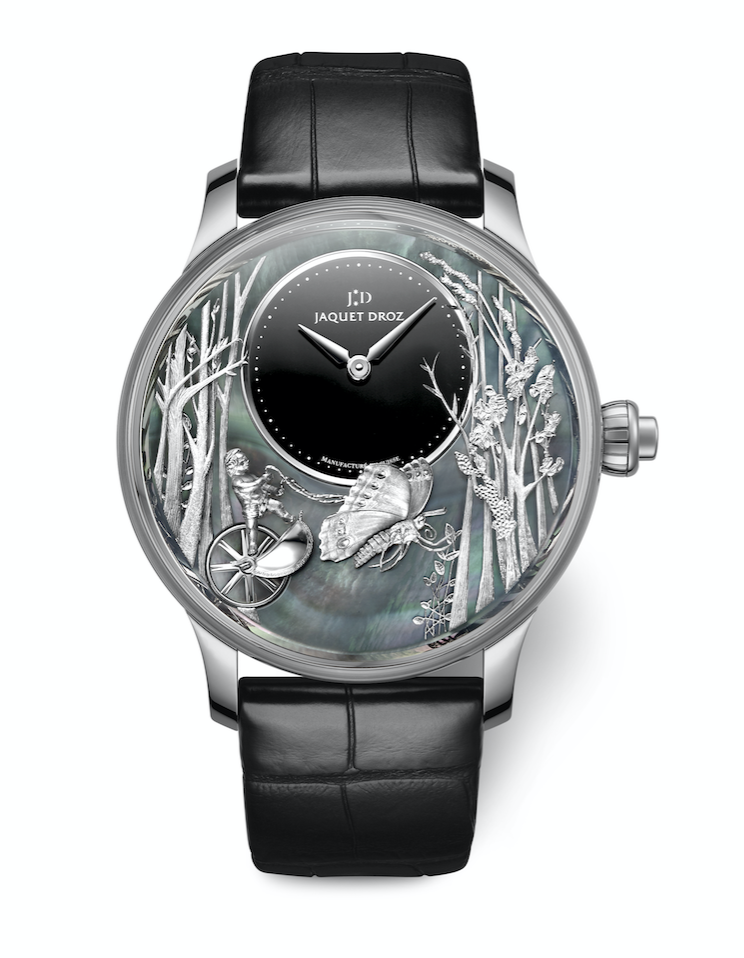 Fueron tres años los que se necesitaron para crear cada uno de los meticulosos detalles hechos por los creadores-artesanos y relojeros de la firma. El ensamblaje se realiza a mano, con más de 40 elementos en oro blanco o rojo, de acuerdo a la configuración, mientras que los grabados de la carátula reflejan el savoir-faire relojero de los artistas. Perteneciente a la colección de relojes autómatas de Jaquet Droz, esta nueva maravilla añade la icónica carátula del Petite Heure Minute, ahora en un ambiente más naturalista que evoca a la región de La Chaux-de-Fonds, sitio en donde se erige la Manufactura, y cuna de la relojería tradicional helvética.