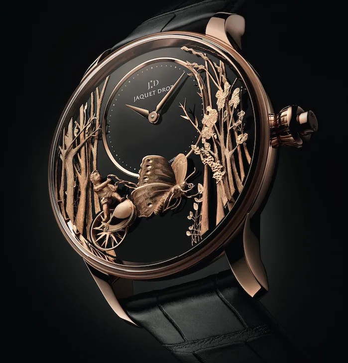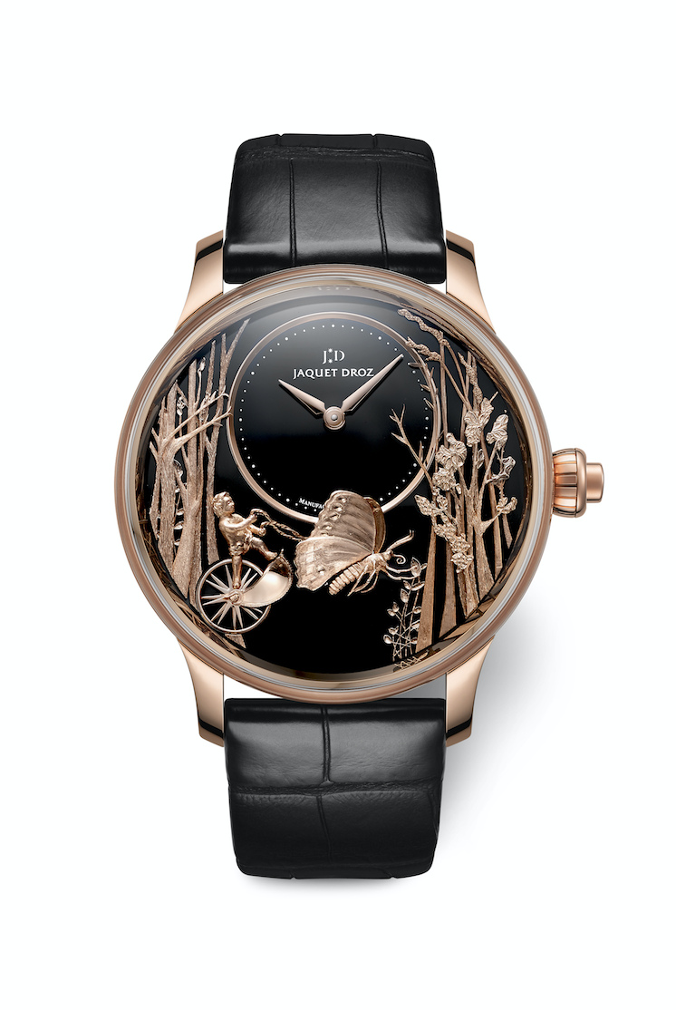 La visión clásica de la relojería, es una de las claves principales con la que Jaquet Droz desarrolla sus encantadoras piezas, las cuales además albergan en su interior un trabajo artesanal excepcional aunado a la mecánica de alta precisión. Loving Butterfly Automaton, es la nueva pieza autómata que refleja la belleza de una obra de arte vislumbrada por el relojero, *Henri-Louis Jaquet Droz hace 242 años. Este modelo que toma vida a través de un mecanismo dedicado a la animación de la carátula, deja a la vista el encantador movimiento de una escultura de mariposa que tira una carreta sostenida por un ángel. Producto de dos patentes, el Loving Butterfly Automaton está dotado por tres barriletes conectados a la corona para la acción de carga. Esta energía es necesaria para brindar la maravillosa animación referida, pues hasta 300 aleteos de la mariposa serán ejecutados en un espacio de dos minutos aproximadamente, todo ello sin perder un ápice de precisión para la indicación horaria.