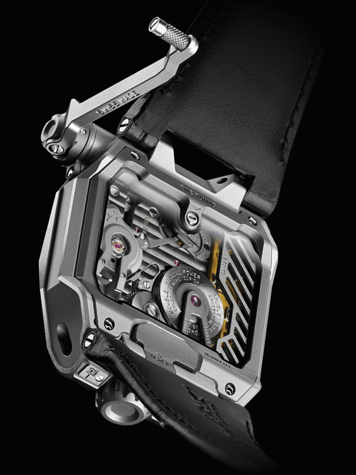 La novedosa máquina de Urwerk presenta cuatro indicadores principales de forma ordenada y separada a partir de una cara frontal que exhibe un diseño tipo bloque de motor, pero que a través de cuatro ventanillas posibilita una lectura increíblemente sólida de: indicador de precisión a demanda en (tasa delta δ) precisión que irá de -20 a + 20 segundos cada 24 horas; segundero en posición de la 1:30 por aguja; horas y minutos a las 5 h y finalmente un indicador de la reserva de marcha dispuesto a las 7:30 horas. La corona completa la experiencia visual situándose a las 6 y un grabado EMC resalta la nueva complicación desarrollada por Urwerk, pero eso no es todo, si damos vuelta a la caja, podremos observar el circuito que regula y monitorea la precisión del reloj, asimismo la dualidad de barriletes acoplados, parte del volante y una “manivela” de carga manual que remplaza dicha acción ejercida a partir de la corona.