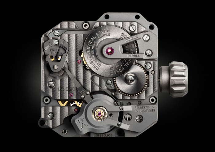 Elementos que dan vida y garantizan el correcto funcionamiento del reloj: rueda de balance fabricada por ARCAP específicamente para Urwerk, construída en aleación anticorrosiva y antimagnética, garantizando su aerodinámica en función de la pérdida de amplitud; dualidad de barriletes interconectados, montados verticalmente en un solo eje para proveer autonomía de hasta 80 h, capacidad energética en función de la garantía de un desempeño óptimo y estable; tornillo de ajuste al anverso del reloj de fácil acceso para ejecutar los ajustes pertinentes directamente al órgano regulador, acelerando o desacelerando gracias al cambio en la longitud de la espiral; finalmente la acción de monitoreo fue ejercida por Oliver Evalet, desarrollador de software e informática, que logró crear un sistema confiable diseñado para funcionar a largo plazo que obtiene su energía a partir de un condensador de alto rendimiento, lo cual garantiza que dicho avance tecnológico jamás afecte la regularidad del mecanismo.