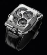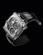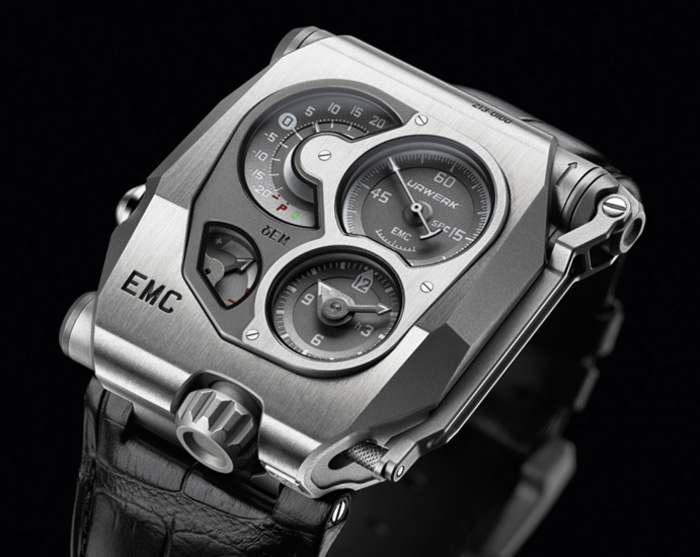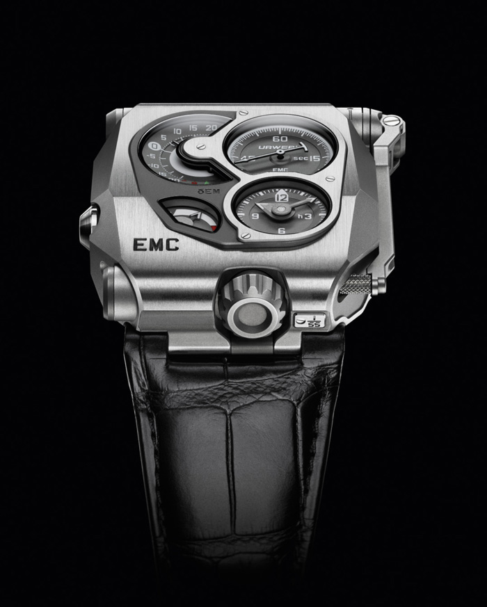 URWERK EMC // Movimiento: mecánico de carga manual / Calibre: UR-EMC de manufactura / Frecuencia: 28, 800 a/h / Reserva de marcha: 80 h / Acabado: Côtes de Genève / Caja: 43 mm de titanio y acero / Funciones: horas y minutos por aguja; segundos en sub-carátula; indicador y regulador de precisión delta / indicador de reserva de marcha.