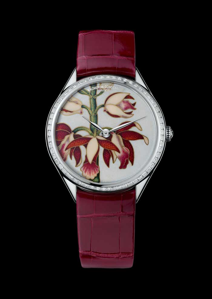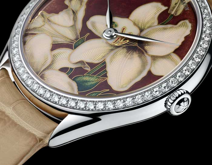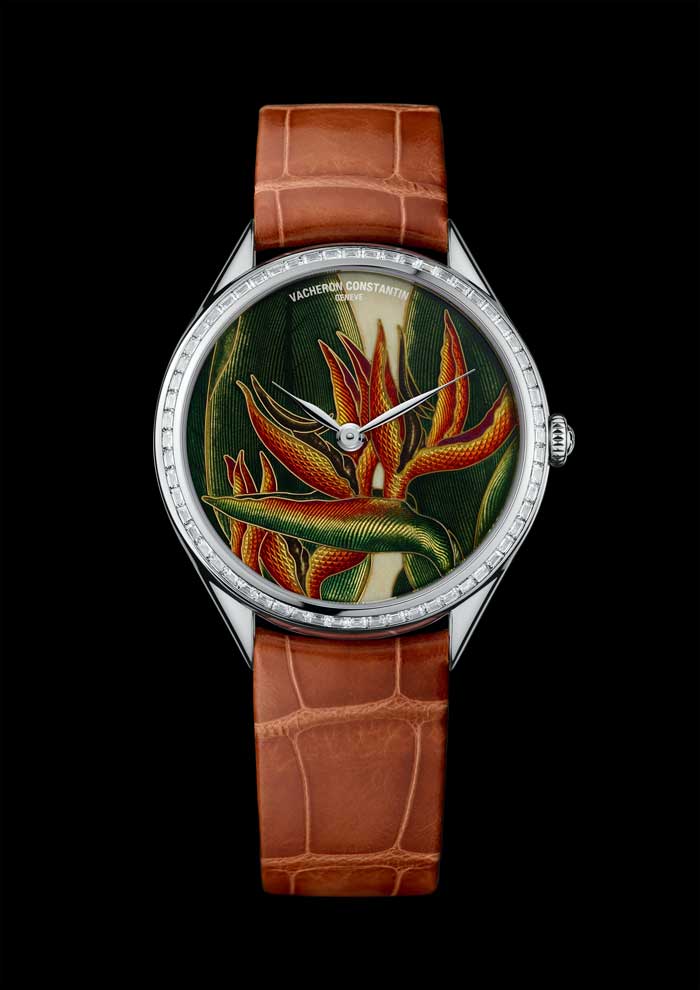 La planta strelitzia de Sudáfrica llegó al Real Jardín Botánico de Kew, en 1773. El director de los famosos jardines, Sir Joseph Banks – a quien Francis Masson, después de haber navegado con James Cook, trajo la flor. La llamó así en homenaje a la Reina de Inglaterra. Un símbolo de la lealtad, y buena suerte. El Strelizia se posa sobre la carátula del reloj perteneciente a la colección Métiers d’Art Florilège. Los patrones guilloché dan fe de la sensibilidad artística del artesano, mientras que los brillantes colores del esmaltado añaden profundidad a la línea para lograr un realismo asombroso.