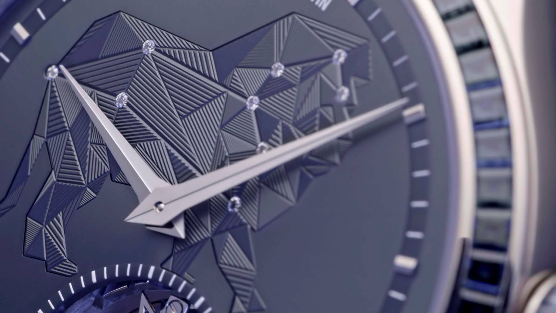 Dado que las máquinas de guilloché manejadas por las manos expertas de hábiles artesanos están diseñadas para grabar elementos decorativos generalmente circulares y geométricos, resulta fácil comprender las dificultades que implica la representación de un león formado por una combinación de polígonos cuyos grabados lineales proporcionan sorprendentes efectos de profundidad. Las estrellas que componen la constelación están representadas por diamantes de talla brillante que adornan el pelaje del gran felino.