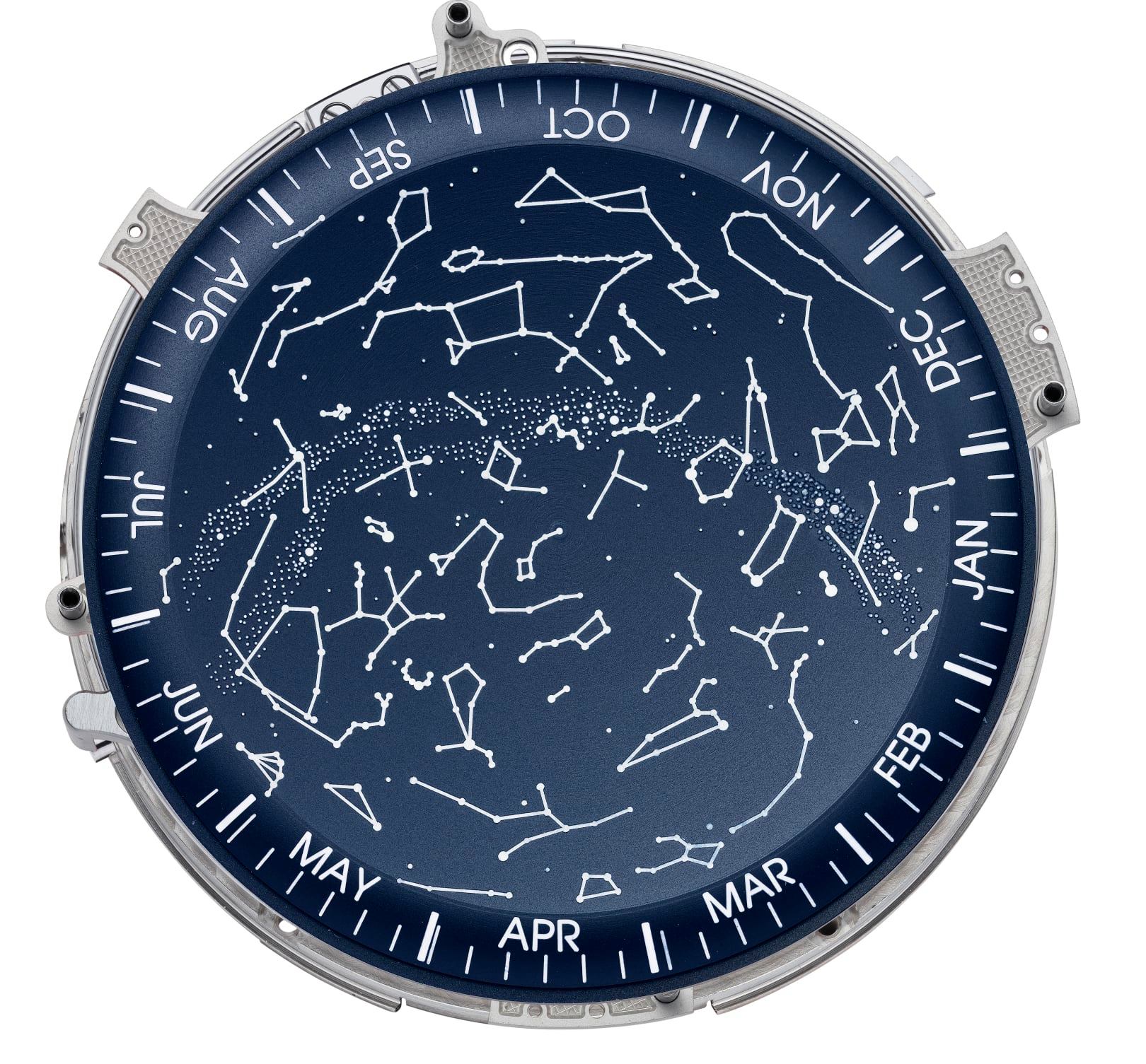 Esta indicación es esencial para ajustar correctamente la carta celeste que gira bajo el cristal de zafiro. El cristal de zafiro también aloja una elipse descentrada que sirve para destacar la posición  exacta de las constelaciones en el hemisferio norte en el momento en que se consulta el reloj.
