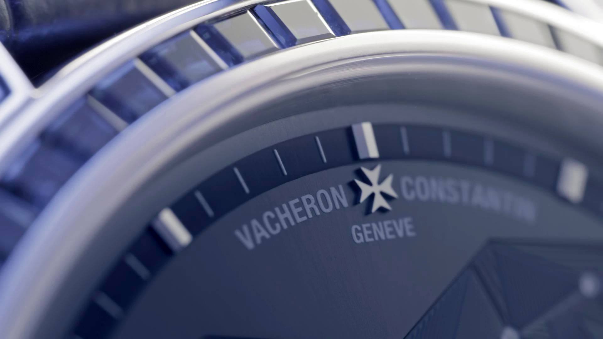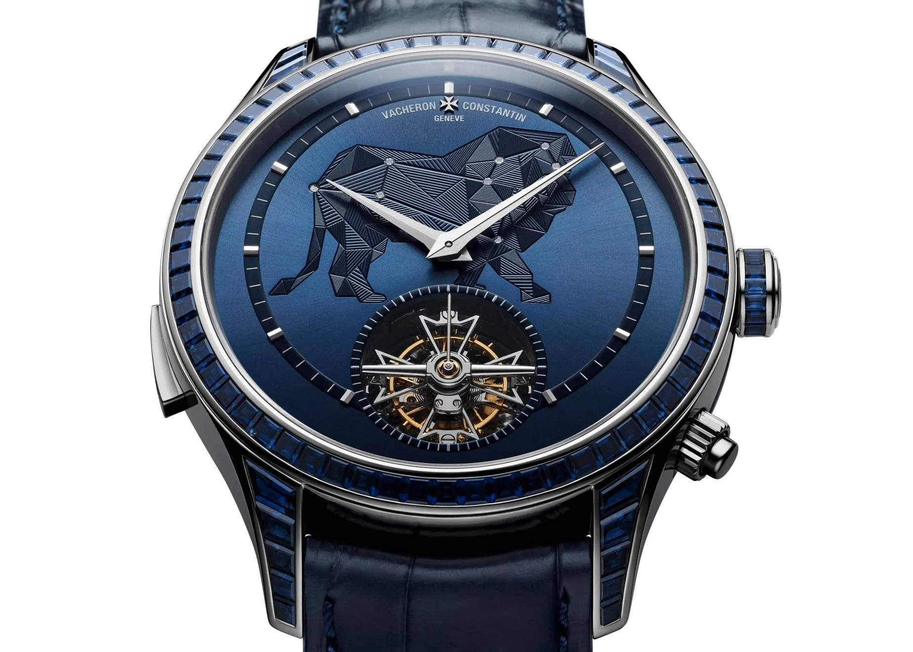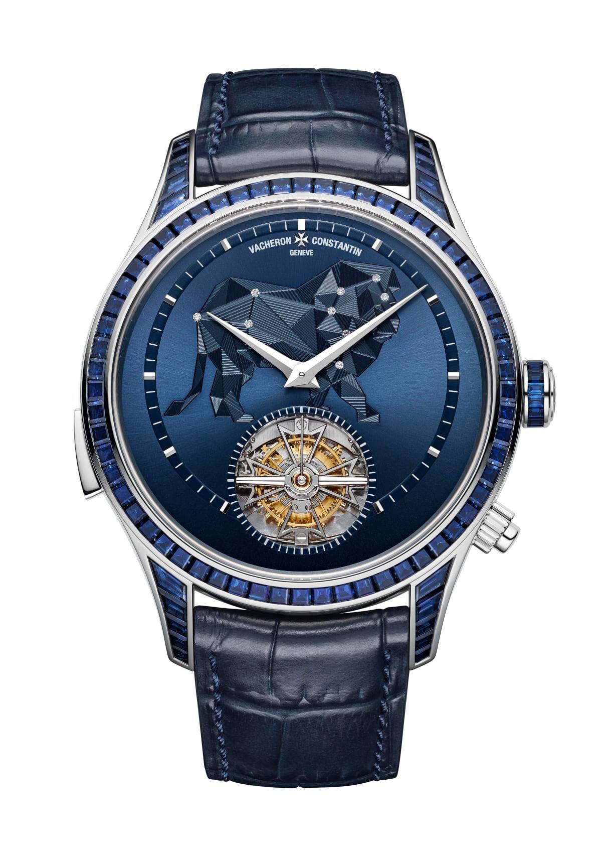 El engaste se coloca en la caja de oro blanco de 18 quilates de 45 mm, adornada con 100 zafiros talla baguette engastados en las asas, la corona y el bisel. La carátula azul opalina tono sobre tono ofrece una representación simbólica de la constelación de Leo. La silueta del felino, una auténtica obra maestra de la técnica de guilloché realizado a mano en los talleres de Vacheron Constantin, está compuesta por una multitud de formas geométricas con motivos propios. La constelación de Leo está resaltada por los diamantes de talla brillante que adornan el pelaje del león.