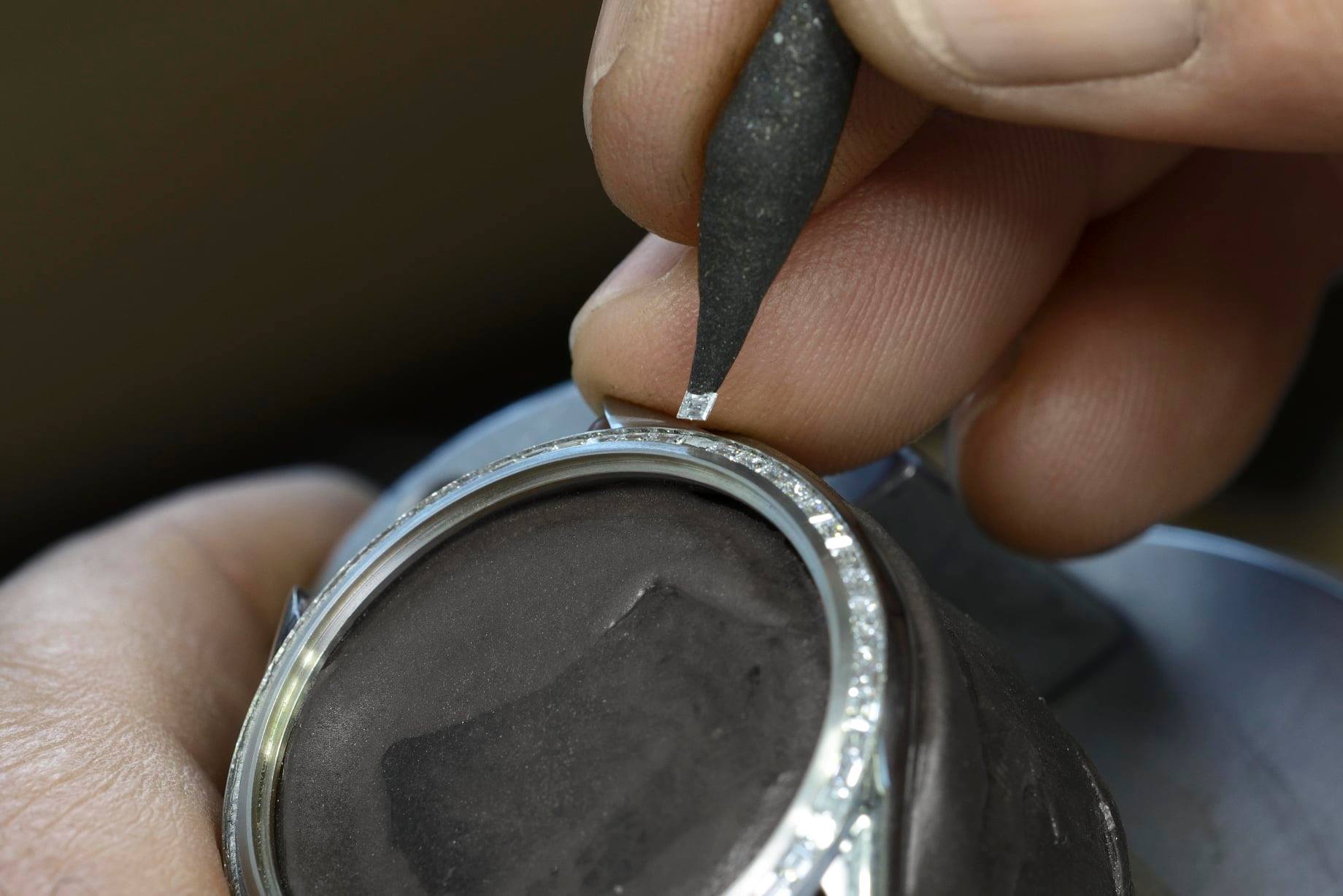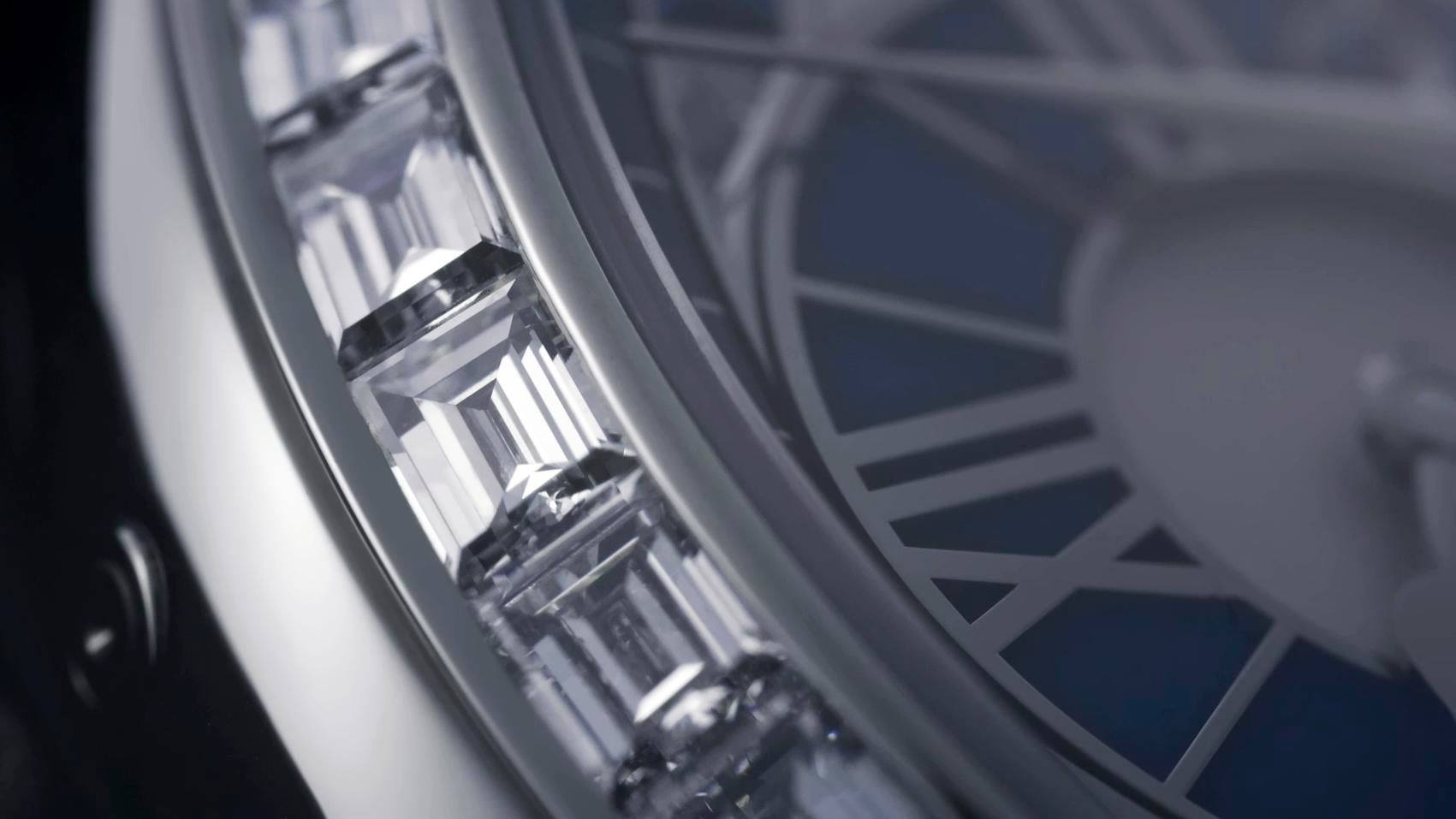 - Carátula: plateada con guilloché a mano y motivo de espiral engastada con 36 diamantes talla baguette y 10 zafiros; agujas de oro blanco de 18 quilates