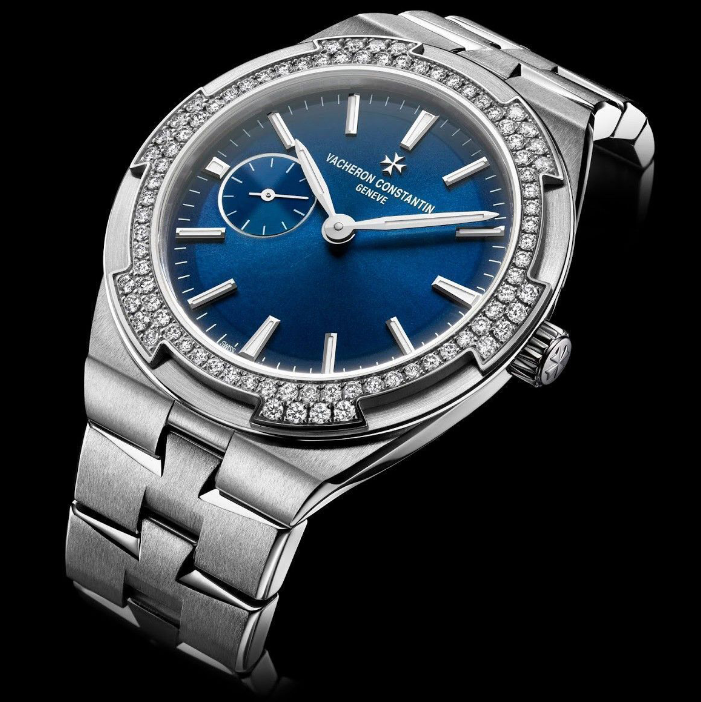 Overseas tamaño pequeño referencia 2305V/100A-B170. La pieza está desarrollada en caja de 37 mm de acero inoxidable con engaste de 84 diamantes en el bisel. Animado por el calibre mecánico automático 5300 galardonado con el Poinçon de Genève, vibrará a 4 Hz durante –no menos– de 44 horas. Su carátula recibe un tratamiento soleil y un bellísimo azul océano, mientras que indica las horas y minutos por agujas centrales, y los segundos mediante una subcarátula en punto de las 9 horas.